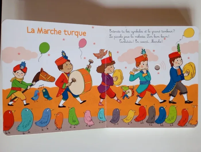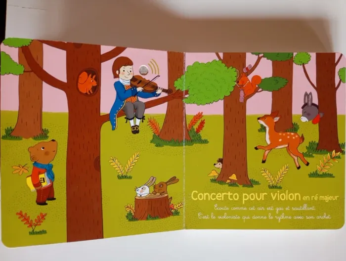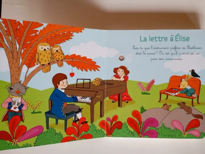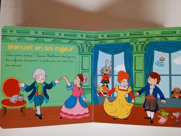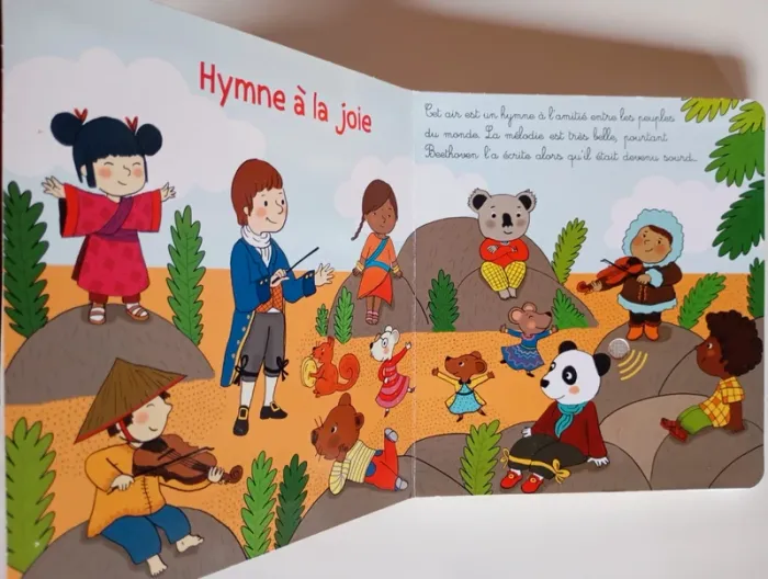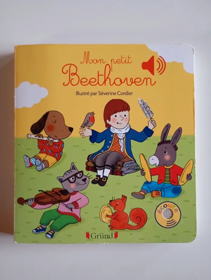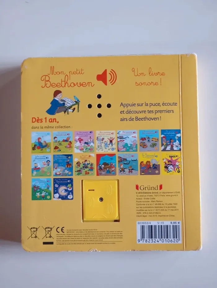 Mon premier livre sonore à la découverte de Beethoven ! Avec ses puces sonores ce recueil est unique. Sur chaque page, l'enfant recherche dans l'illustration le petit bouton qui déclenchera la musique. Une illustration joyeuse accompagne une interprétation des airs les plus connus destinés aux enfants. En écoutant , le petit peut observer les détails de l'image tout en étant autonome. Il retrouvera au fil des pages : L'hymne à la joie ; La marche turque ; La symphonie pastorale ; Le concerto pour piano en Ré majeur ; Le menuet en Sol majeur et la célèbre Lettre à Elise. Éditeur ‏ : ‎ GRUND JEUNESSE 12 pages Âge de lecture ‏ : ‎ 1 - 5 ans Dimensions ‏ : ‎ 15.7 x 1.7 x 17.1 cm Livre en très bon état (Piles neuves!) Je vends d'autres livres sonores #phil_peg_livresonore #livresonore #mespremièresmusiques #beethoven