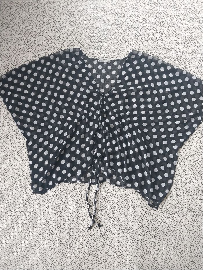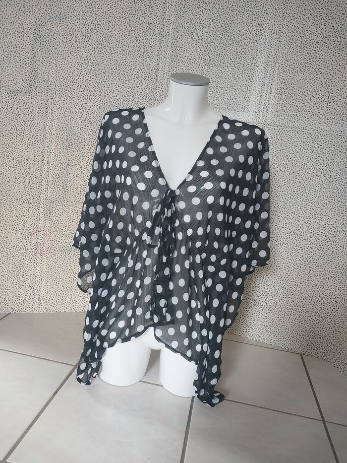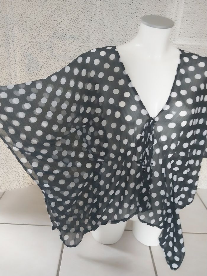 Très joli haut fluide transparent, noir à pois blancs, signé Maille Demoiselle. Coupe ample, effet papillon, lien à nouer sur le devant et taille légèrement élastiquée à l’arrière pour marquer la silhouette. Léger et aérien, parfait pour l’été ou comme haut de plage par-dessus un maillot. 📏 Taille : convient du 38 au 42 (coupe ample et adaptable) 🎀 Matière : voile léger, transparent ✨ État : très bon état Idéal pour un look chic et décontracté ou en surchemise d’été.