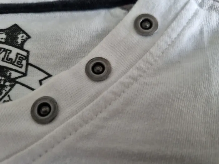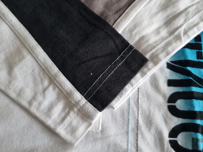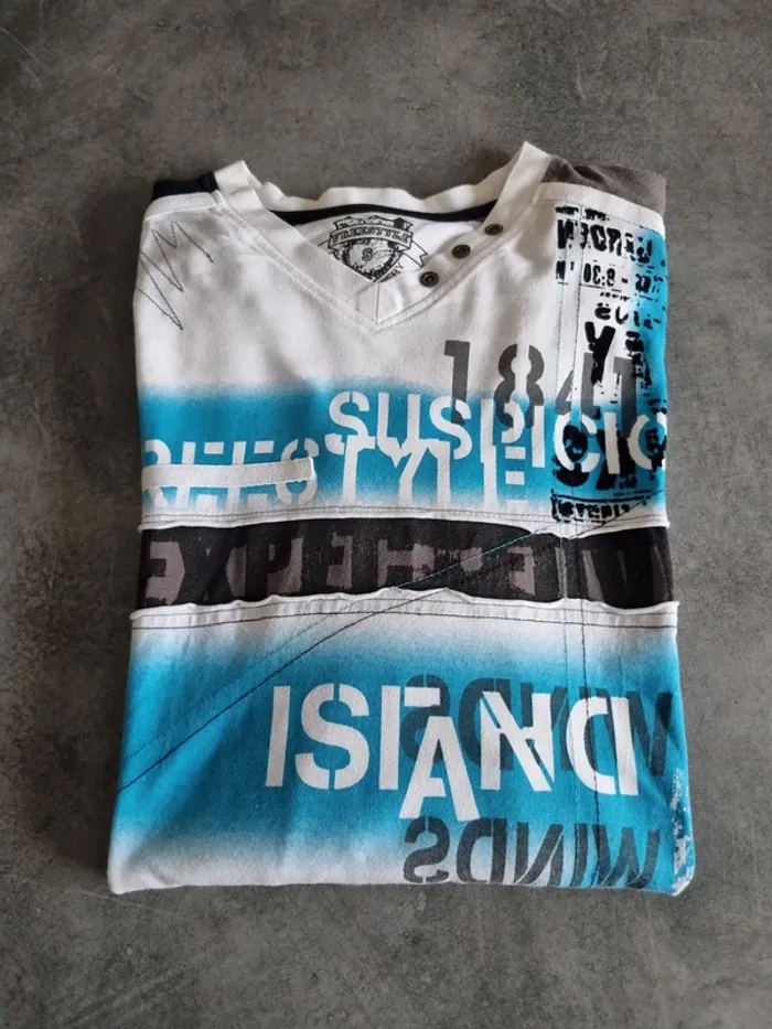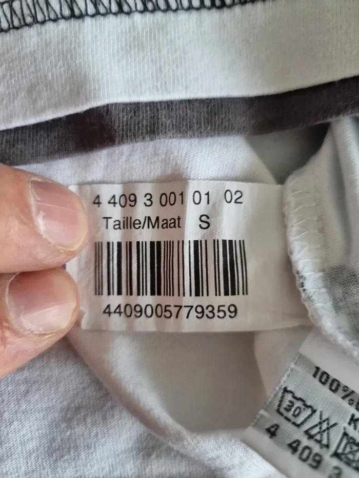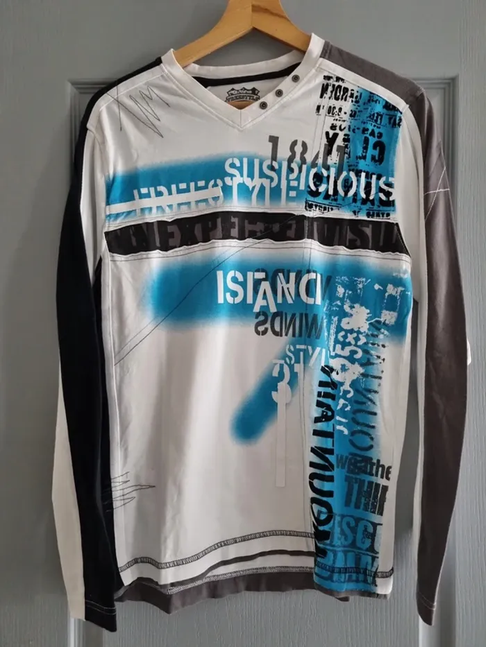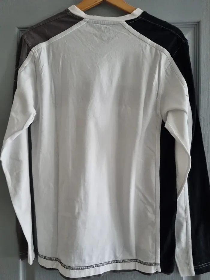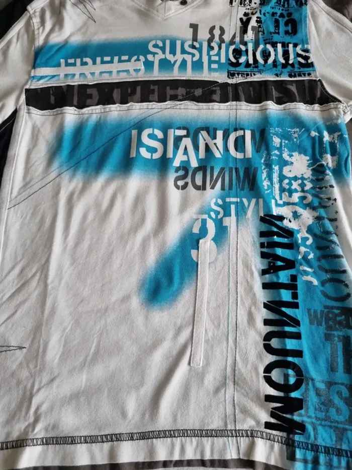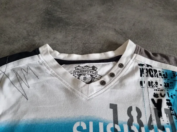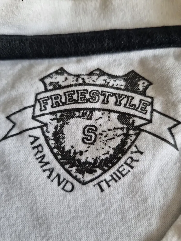 T-shirt de marque "Armand Thiery" Blanc, bleu et noir Manches longues Col en V différents motifs 100% coton Taille S très bon état À retirer sur place ou frais de port à votre charge Pour voir d'autres affaires : #fred5129_affaires_manches_longues Pour voir d'autres affaires : #fred5129_taille_s