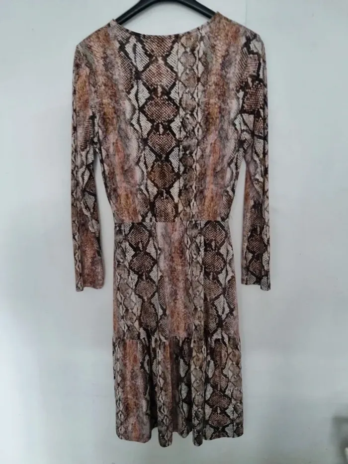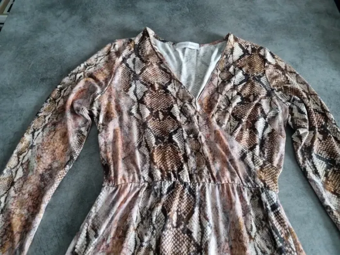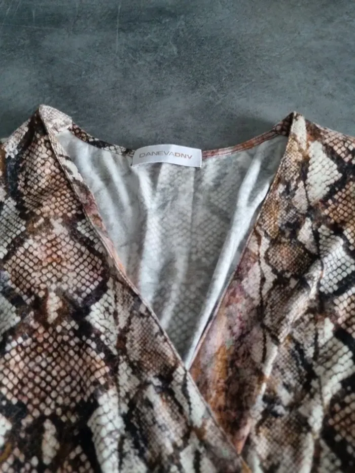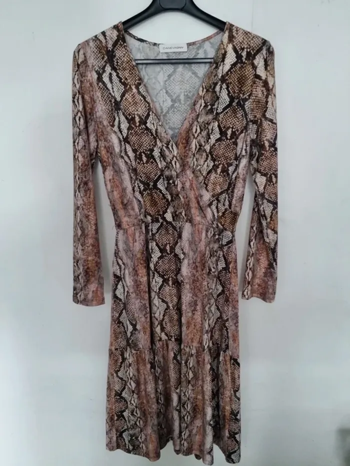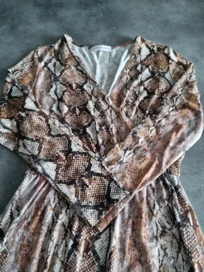 Robe longue évasée imprimée serpent de marque "Daneva" Col effet croisé Manches longues 96% viscose 4% élasthanne Taille S Très bon état A retirer sur place ou frais de port à votre charge Pour voir d'autres affaires #fred5129_robes_jupes_débardeurs Pour voir d'autres affaires : #fred5129_affaires_manches_longues Pour voir d'autres affaires : #fred5129_taille_s