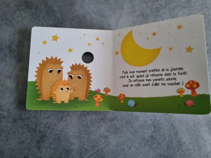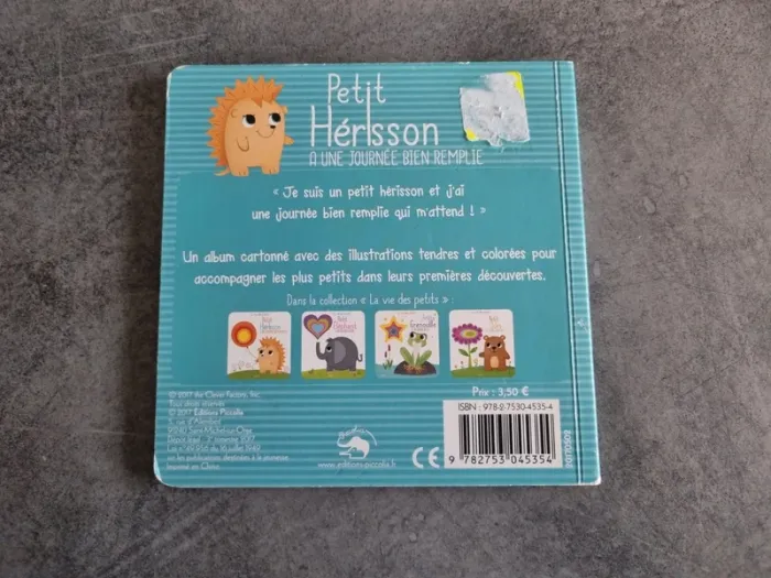 Livre " Hérisson a une journée bien remplie " " je suis un petit Hérisson et j'ai une journée bien remplie qui m'attend ! " Un album cartonné avec des illustrations colorées pour accompagner les plus petits dans leurs premières découvertes. Dimensions : 15 x 15 cm ISBN : 9782753045354 Très bon état A retirer sur place ou frais de port à votre charge Pour voir d'autres affaires : #fred5129_livres