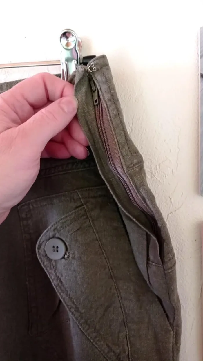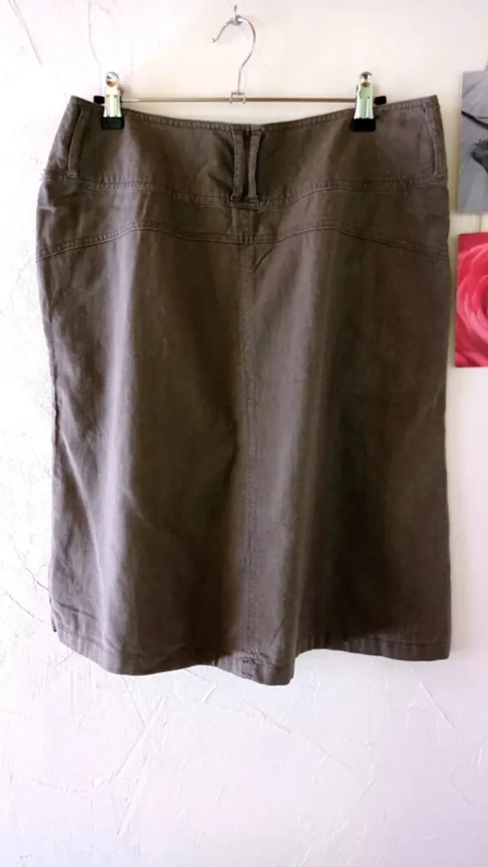 Jolie jupe kaki (lin 55% et 45% viscose), mi-longue. 2 poches à l'avant. Fermeture éclair sur un côté avec un petit crochet. Très bon état. Largeur à plat à la taille : 41cm, longueur : 57cm environ (58 à l'arrière). Très bon état. #frip_femme40 ⚠️lots : contactez-moi pour que je vous fasse une annonce spécifique si vous souhaitez faire un lot, une remise sera effectuée sur le total 😊😊