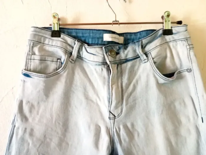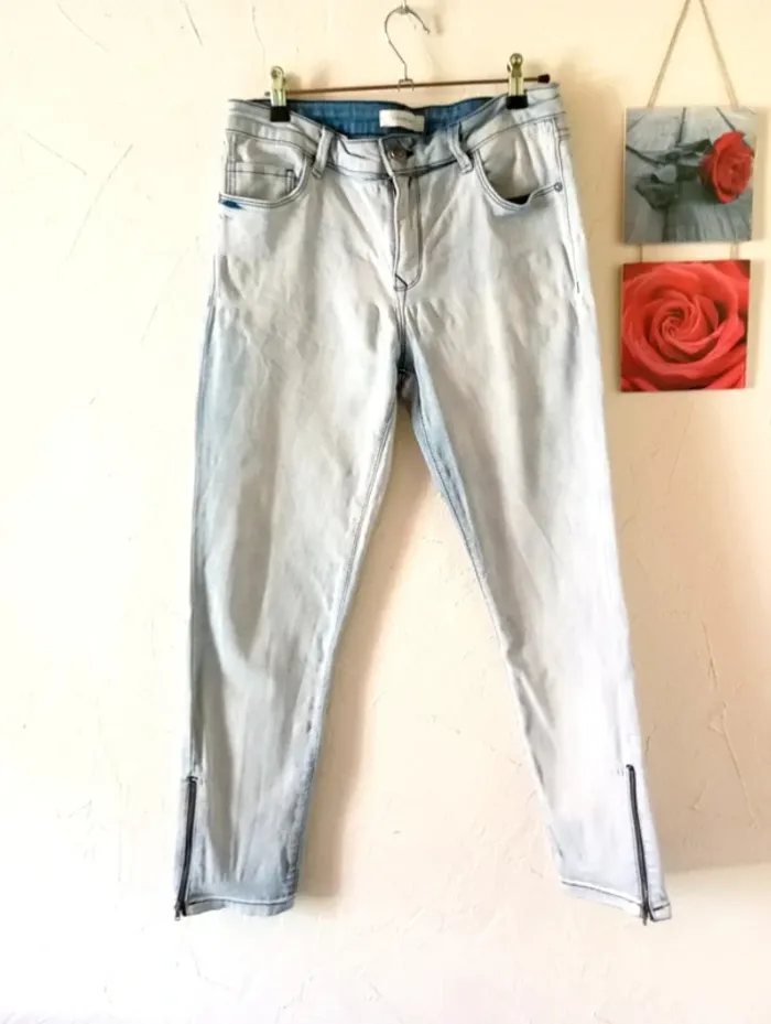 Joli jean bleu très clair, coupe slim, assez court (7/8). Fermeture éclair en bas des jambes. Etiquettes manquantes mais correspond à un 40. Assez extensible. Très bon état général. Largeur à plat à la taille : 39cm, longueur depuis l'entrejambe : 65cm, longueur totale : 88cm. #frip_femme40 ⚠️lots : contactez-moi pour que je vous fasse une annonce spécifique si vous souhaitez faire un lot, une remise sera effectuée sur le total 😊😊