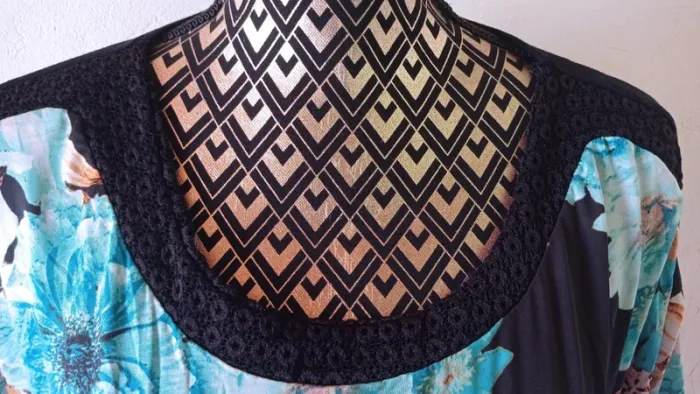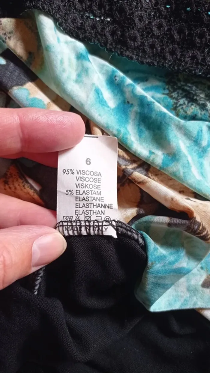 Très jolie tunique assez longue. Devant satiné fleur dans les tons noirs/beige/turquoise. Dos uni. Légèrement transparente. Bande ajourée / brodée sur le bas du vêtement, le col et les manches. noté taille 6 = 46. Très bon état. Largeur à plat d'une aisselle à l'autre : 59cm (sans tirer sur les fronces), longueur depuis le dessus de l'épaule : 71cm environ. Matière extensible. #frip_femme46 ⚠️lots : contactez-moi pour que je vous fasse une annonce spécifique si vous souhaitez faire un lot, une remise sera effectuée sur le total 😊😊