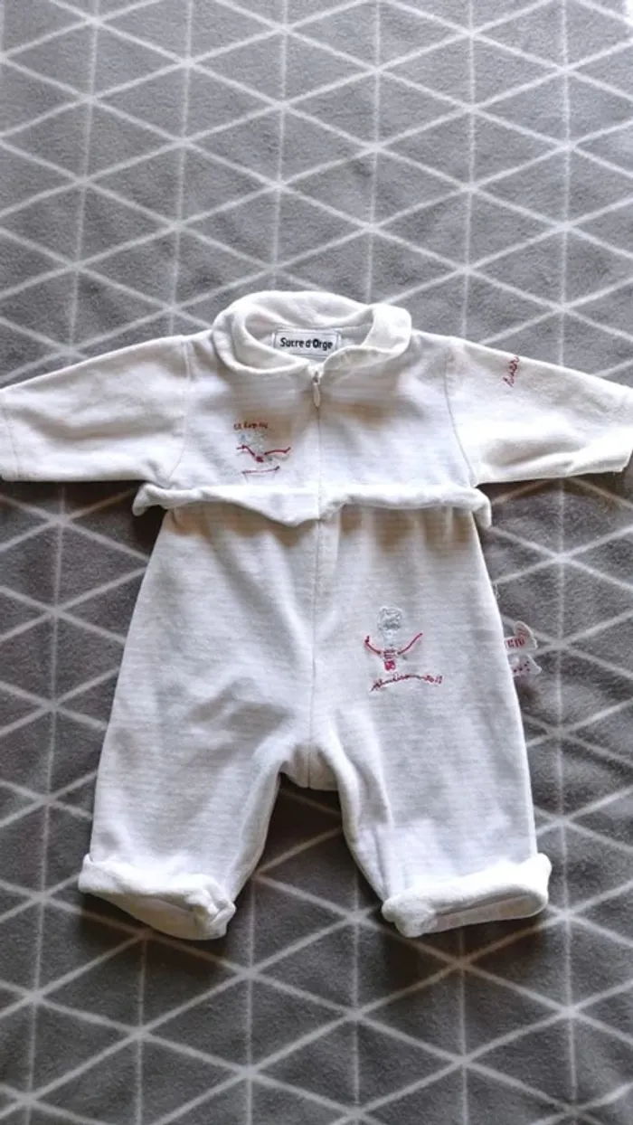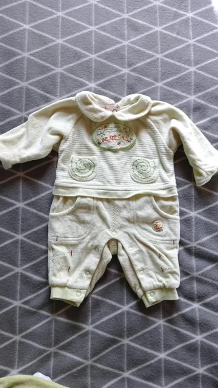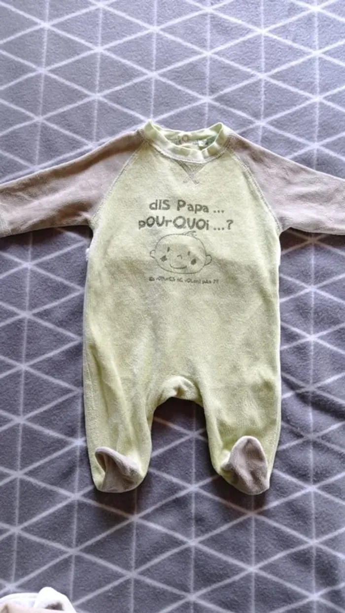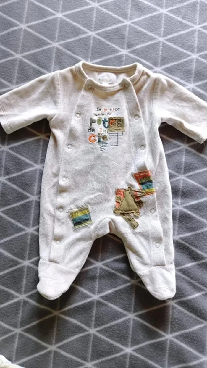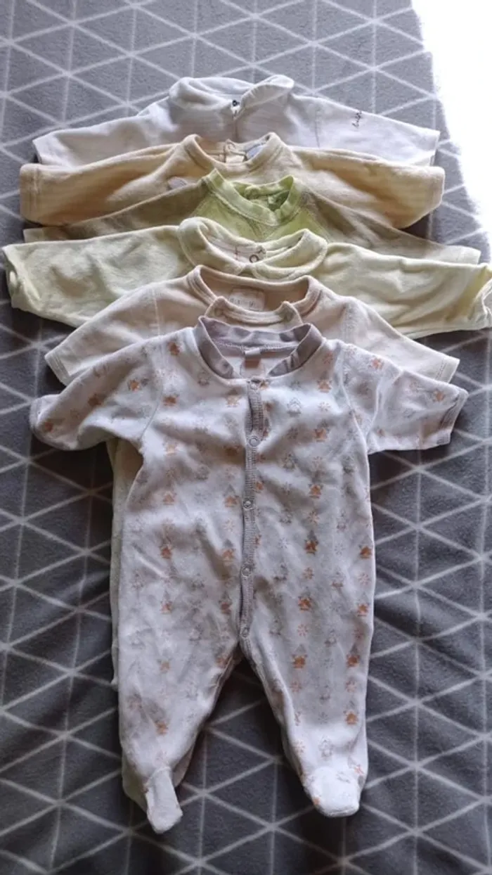 *1 sans marque, gris clair avec motifs gris foncés et orange. Très bon état, juste peinture un peu partie sur certains boutons. *1 la compagnie des petits, beige. Très bon état, juste peinture un peu partie sur certains boutons. *1 petit kimbaloo, bien épais car doublé, sans pied, vert clair, très bon état. *1 petit kimbaloo, vert et kaki. Très bon état malgré une petite tâche à l'arrière d'une jambe (ressemble à un point de peinture). *1 babygro, jaune pâle. Très bon état. *1 Sucre d'orge, blanc avec rayures bleues claires avec une fermeture éclair, sans pied. Très bon état. #frip_bébégarçonUnMois ⚠️lots : contactez-moi pour que je vous fasse une annonce spécifique si vous souhaitez faire un lot, une remise sera effectuée sur le total 😊