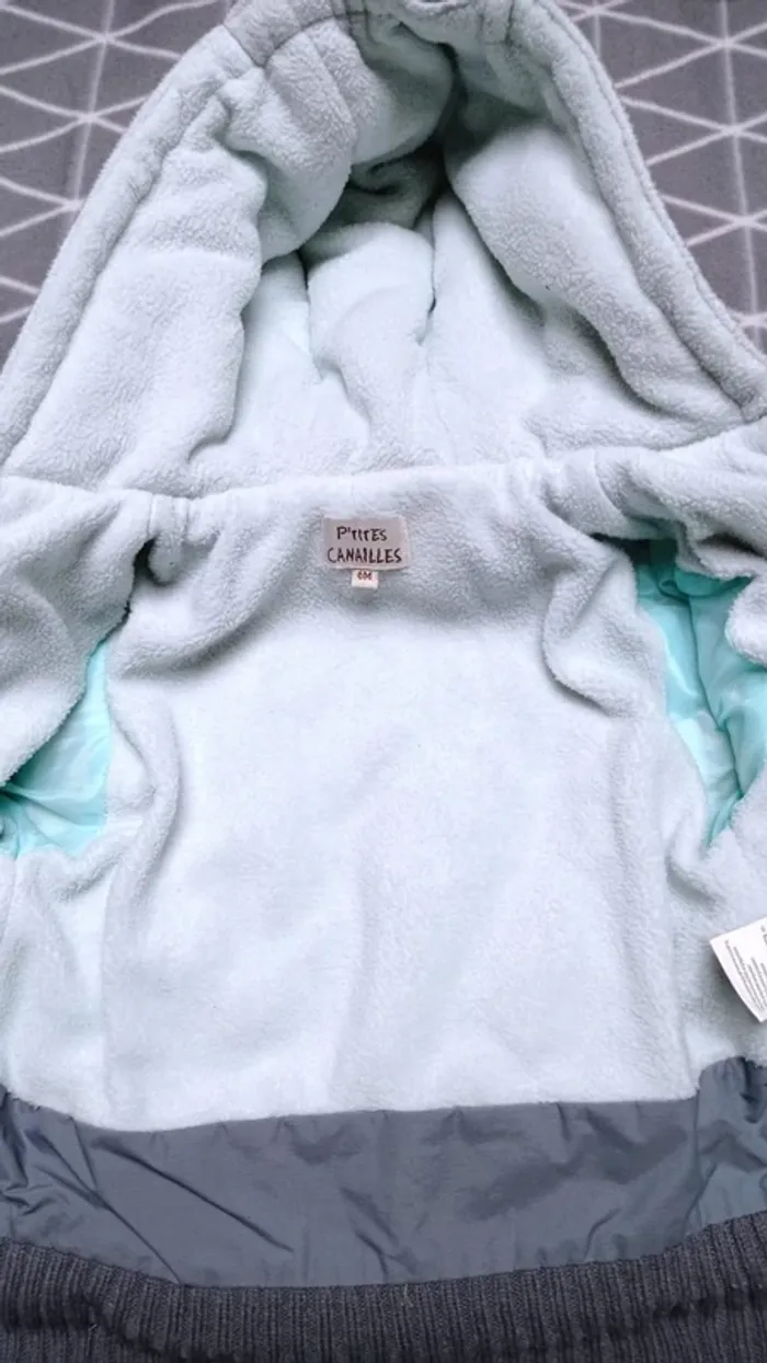 Joli manteau avec capuche, couleur gris bleuté, doublé en polaire. Fermé par fermeture éclair plus boutons pressions. Très bon état malgré une toute petite tâche de décoloration qu'on peut voir sur la seconde photo (à côté du bouton pression du haut). #frip_bébégarçonSixMois ⚠️lots : contactez-moi pour que je vous fasse une annonce spécifique si vous souhaitez faire un lot, une remise sera effectuée sur le total 😊