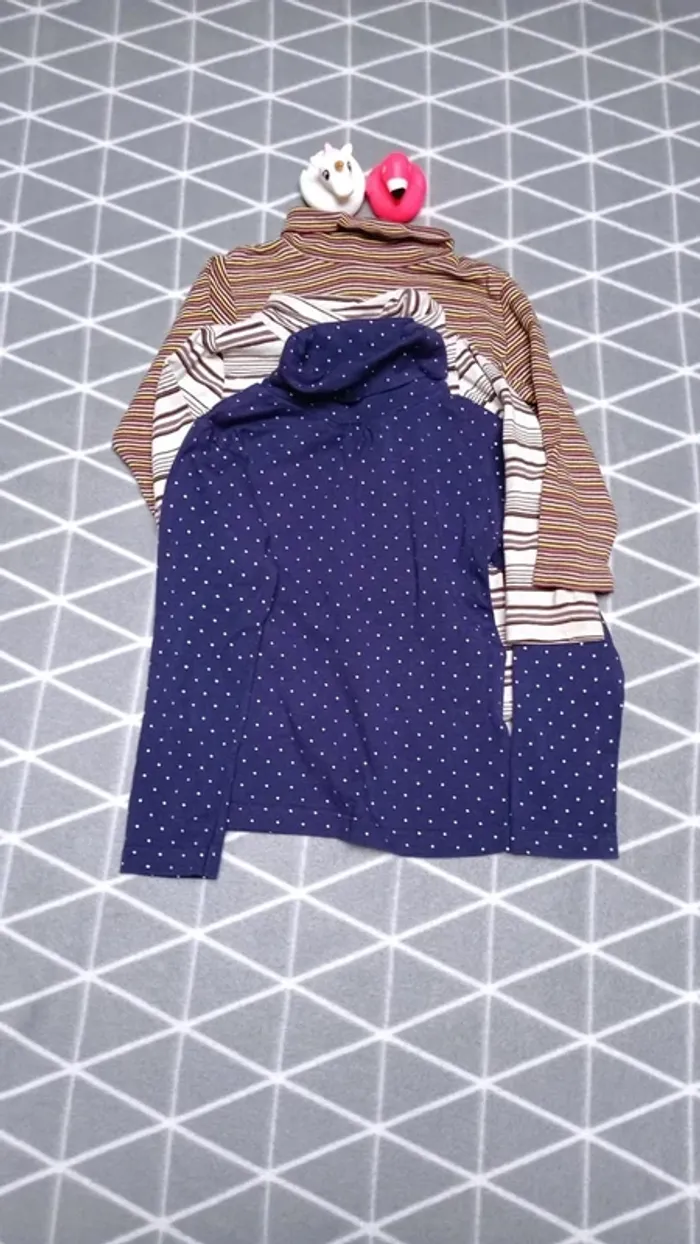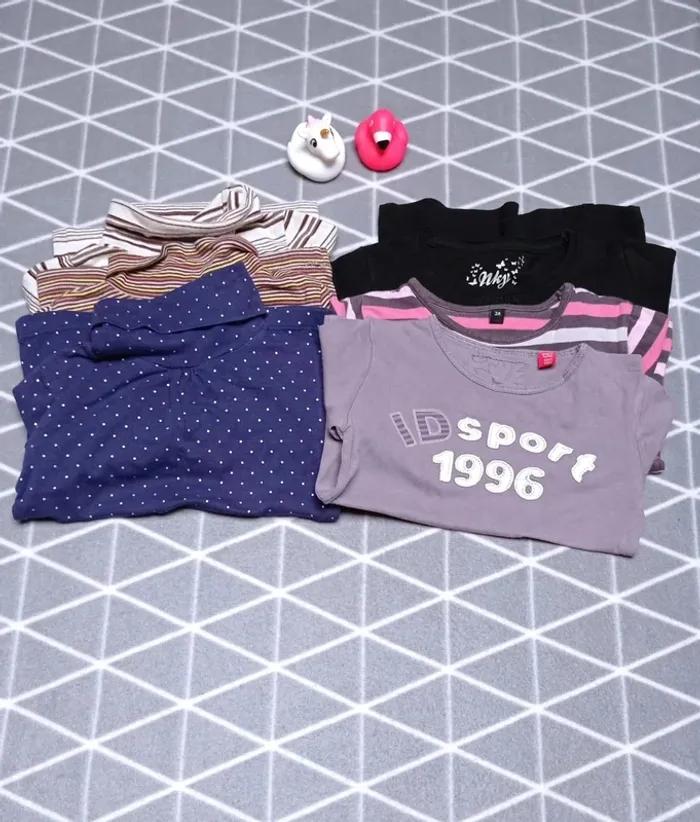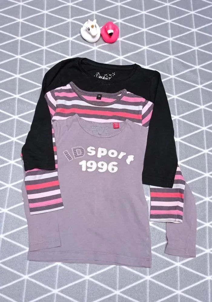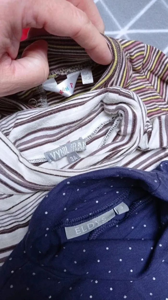 🦄1 t-shirt manches longues noir, couleur un peu passée, NKY, bon état 🦄1 t-shirt manches longues à rayures, couleurs un peu passées, bon état 🦄1 couleur entre lilas et gris, ID Sport, très bon état général 🦄1 sous-pull bleu marine à pois argenté. Eldys, très bon état 🦄1 sous-pull à rayures multicolores, 3 boutons pressions en haut du dos, fil décousu à un endroit de la taille (voir photo), Kid Kanai, bon état 🦄1 sous-pull à rayures dans les tons marron et beige. Vinyl fraise, très bon état #frip_fille3ans ⚠️lots : contactez-moi pour que je vous fasse une annonce spécifique si vous souhaitez faire un lot, une remise sera effectuée sur le total 😊