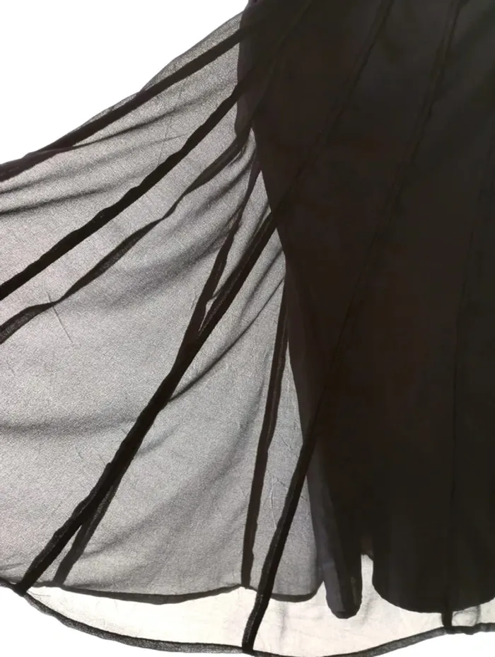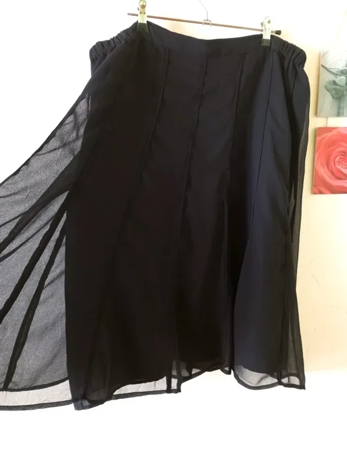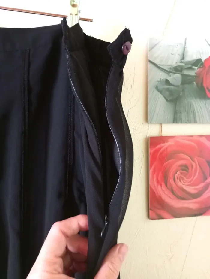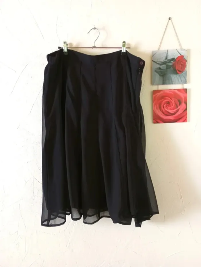 Jolie jupe noire en voile doublé, forme évasée. Se ferme par un bouton et une fermeture éclair sur le côté. 2 petites parties sont élastiquées au niveau de la taille. Largeur à plat à la taille : 48cm (51cm en étirant modérément) , longueur : 68cm environ. Très bon état. #frip_femme52 ⚠️lots : contactez-moi pour que je vous fasse une annonce spécifique si vous souhaitez faire un lot, une remise sera effectuée sur le total 😊😊