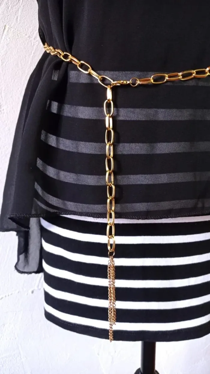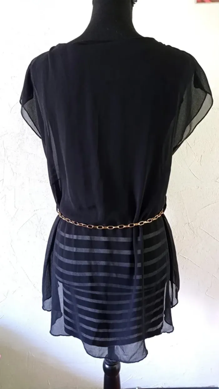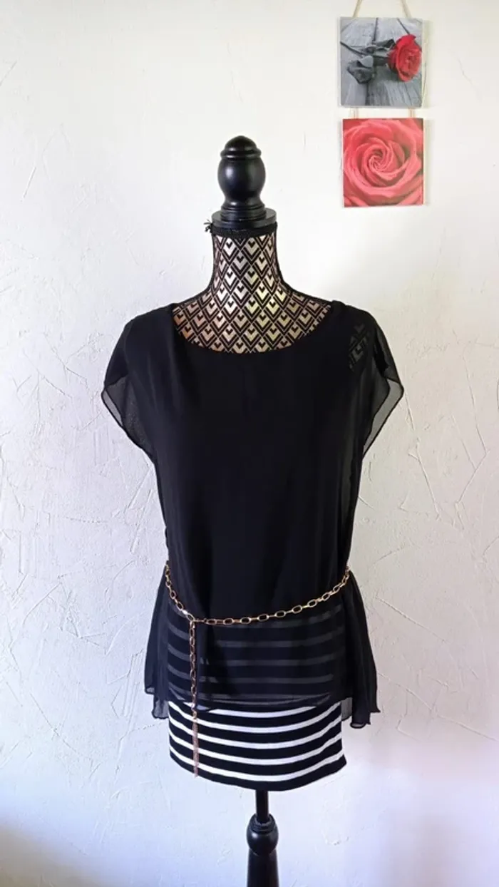 Jolie robe courte avec une partie en tissu léger et l'autre en voile noir. La moitié haute unie noire en voile, plus longue à l'arrière, et le bas blanc et noir à rayures.Ceinture décorative en métal doré type chaînette. Etiquette de taille manquante mais correspondrait à un 38. Largeur à plat d'une aisselle à l'autre : 42cm, largeur à plat à la taille : 38cm. longueur depuis le dessus de l'épaule :74cm environ. Très bon état. Matière extensible : 95% polyester, 5% élastane. #frip_femme38 ⚠️lots : contactez-moi pour que je vous fasse une annonce spécifique si vous souhaitez faire un lot, une remise sera effectuée sur le total 😊😊