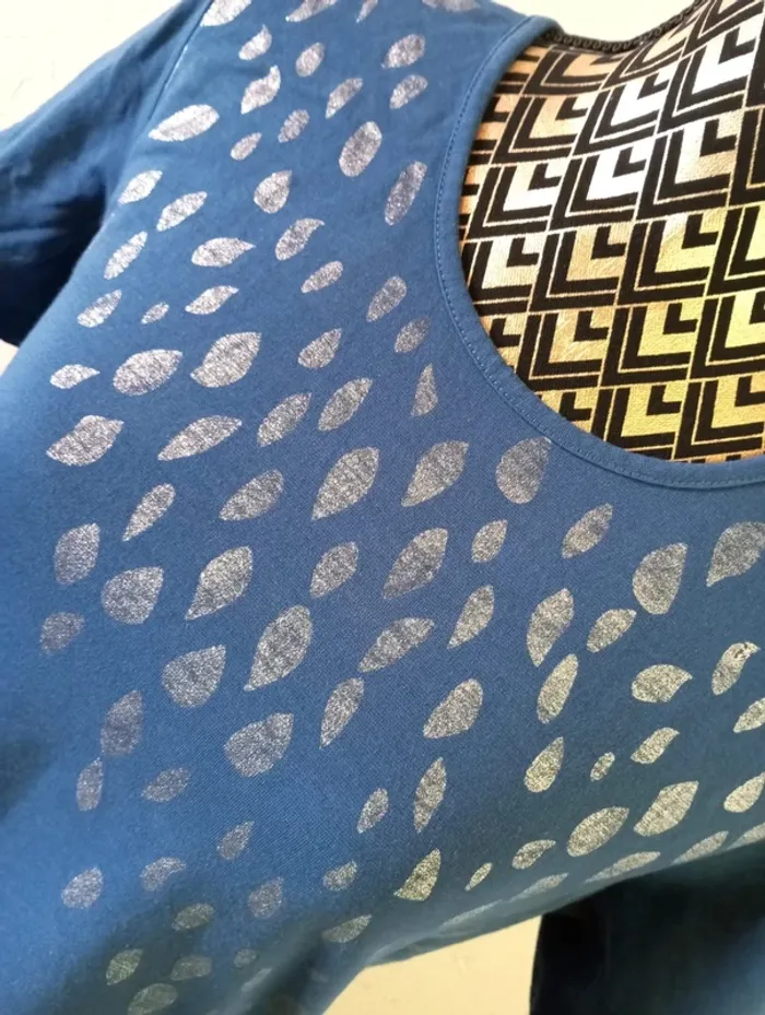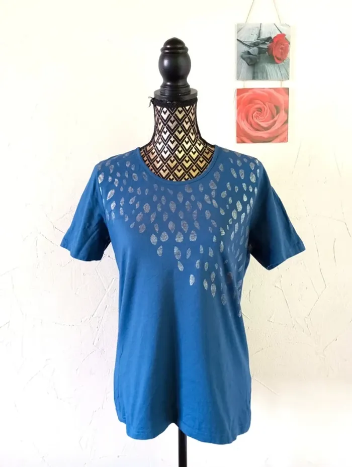Joli t-shirt bleu (un peu plus foncé que sur les photos) avec décos argentées. Etiquettes manquantes mais correspond à un 40 Très bon état général. Largeur à plat d'une aisselle à l'autre : 50cm, longueur à partir du dessus de l'épaule : 64cm environ. #frip_femme40 ⚠️lots : contactez-moi pour que je vous fasse une annonce spécifique si vous souhaitez faire un lot, une remise sera effectuée sur le total 😊😊