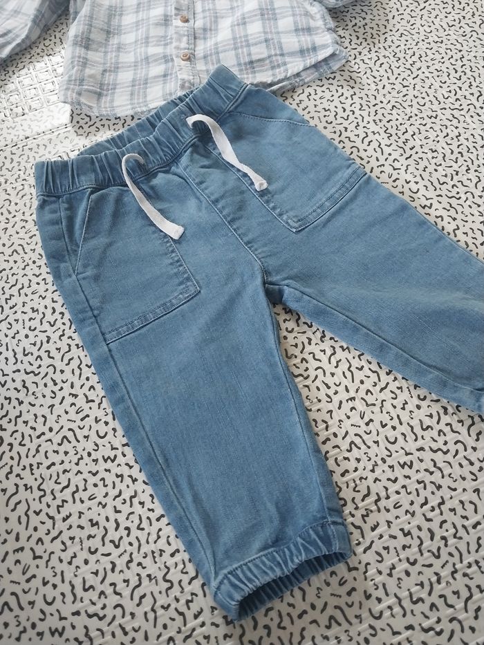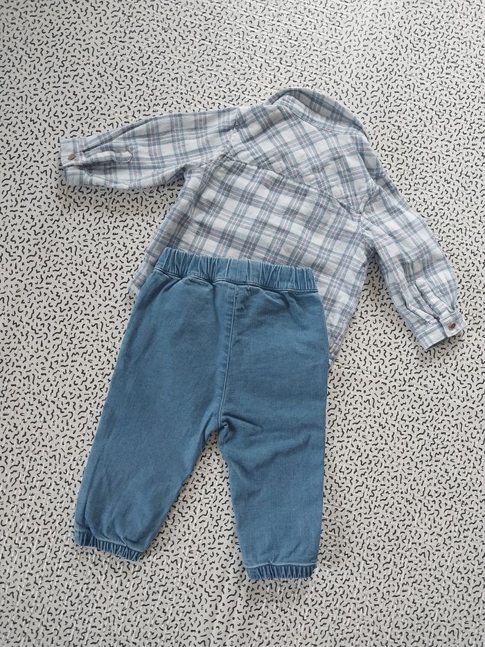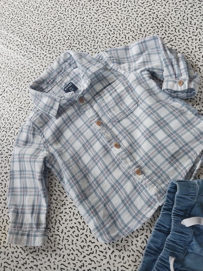 Adorable petit look décontracté composé de : Chemise à carreaux Kiabi (taille 6M – 68 cm / 8 kg) 100% coton, manches longues, boutons bois. Pantalon jean souple Mots d’enfants avec taille élastiquée et cordon ajustable, pratique et confortable. 👉 Taille : 6 mois 👉 Matières : coton (chemise), coton mélangé (pantalon) 👉 État : Très bon état – porté peu de fois. Parfait pour un look tendance et confortable au quotidien ou pour une petite occasion 💙 📦 Envoi possible ou remise en main propre. #bébé #6mois #ensemblebébé #kiabi #motsdenfants