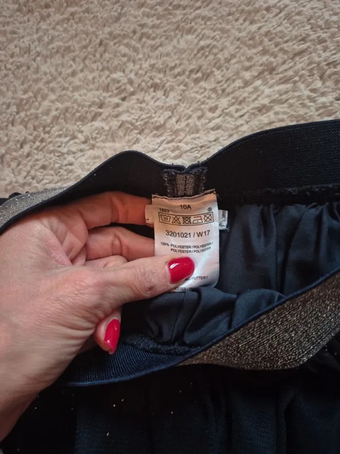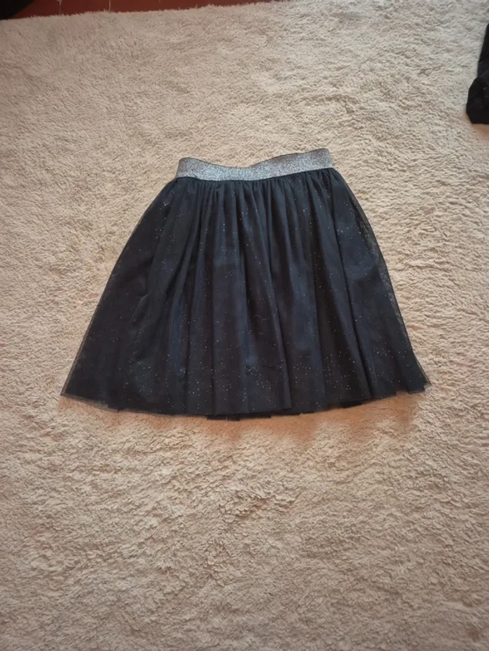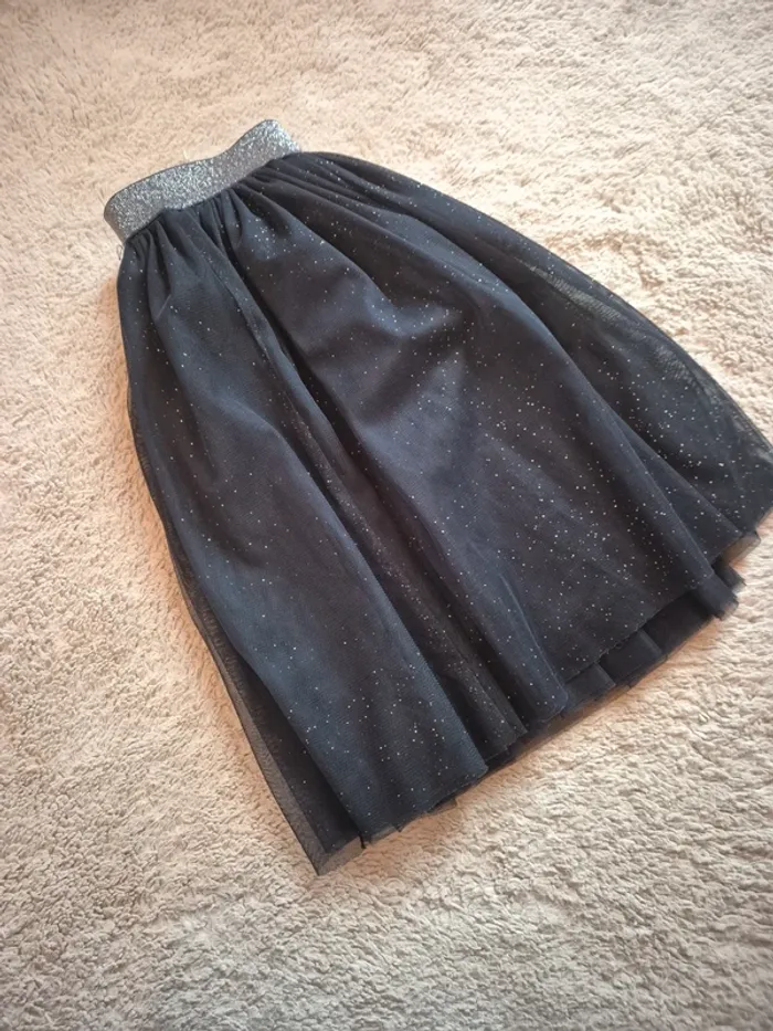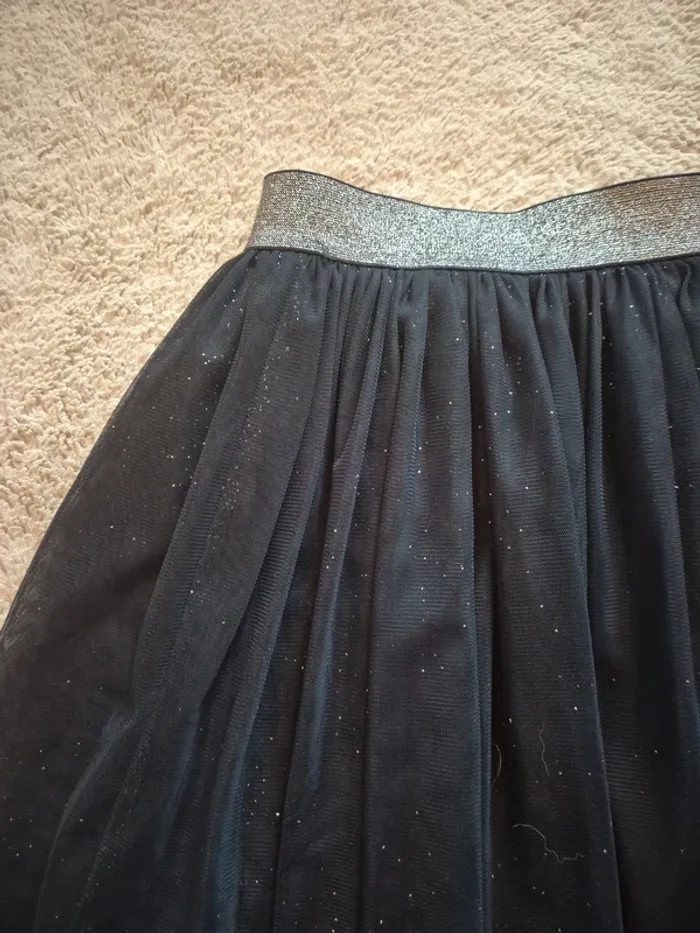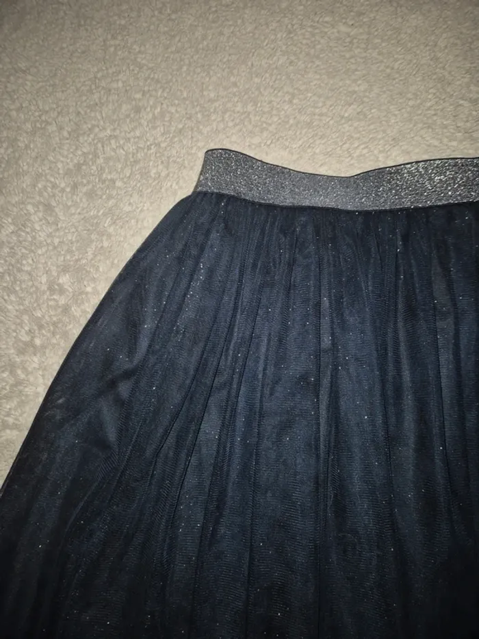 Jupe en excellent état Mise 1 fois Bleue marine foncée (presque noire) avec paillettes argentées Ceinture élastique argentée N'hésitez pas à consulter mon dressing 😁 L'étiquette de la marque à était découpée. Doublure en satin