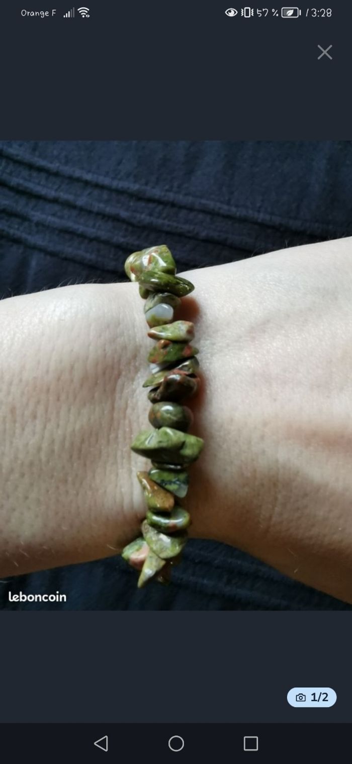 Le jaspe vert améliore la capacité de créativité, visualisation et la volonté. Tous les jaspes agissent sur le caractère émotif en apaisant et en calmant les tensions et en abaissant le niveau d'émotivité. Elles sont utilisées comme pierres d'ancrage. Bracelet élastique.