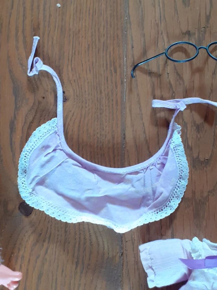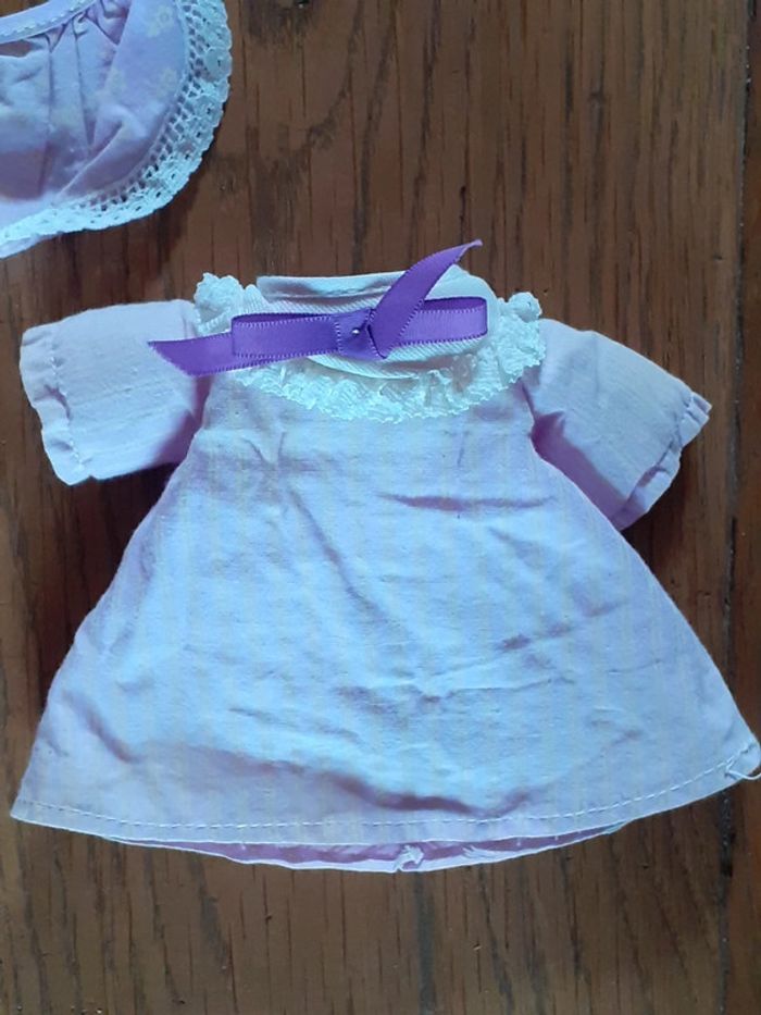 Grand-mère Kiki Monchhichi avec une robe violette ornée de dentelles, avec un col blanc et un nœud violet - certaines parties de la robe sont à rayures, d'autres à fleurs assorti au chignon