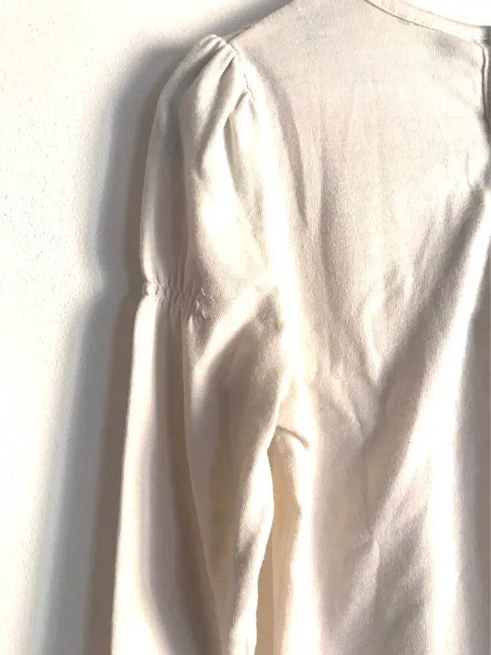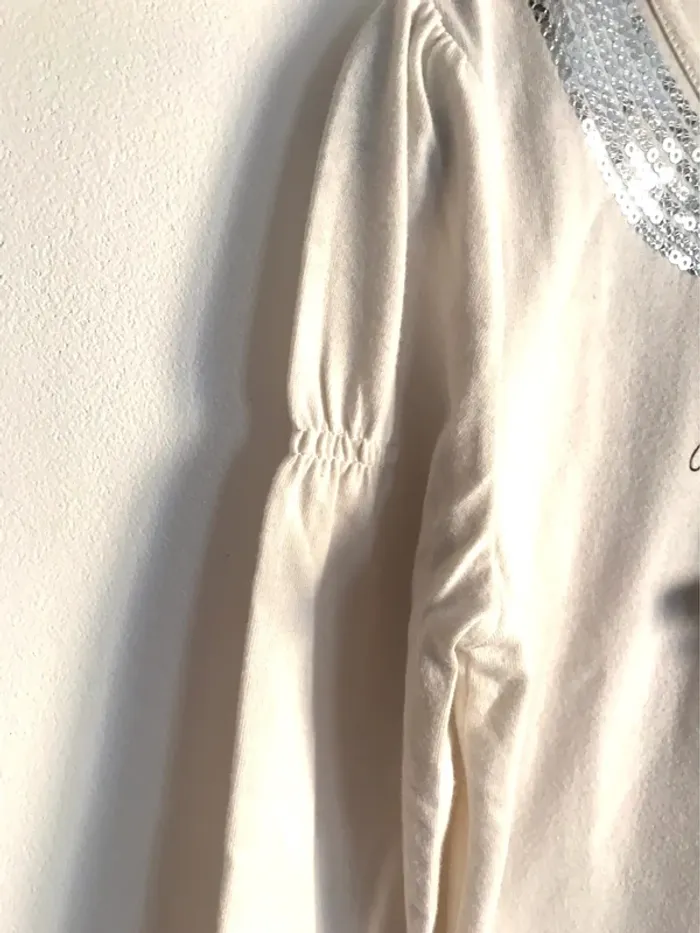 Haut manches longues et à strass. Petite danseuse sur le haut. Col Claudine à sequins. Veuillez consulter mes autres articles car je fais un grand tri 😉. #haut #haut8ans #haut8ansfille #haut8anspetitefemme #motifpetitefemme #colclaudine #colclaudine8ans #colclaudineàsequins #hautcreme8ans #hautasequins #hautasequins8ans