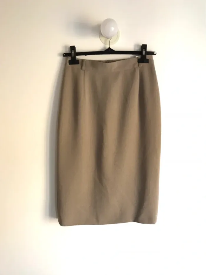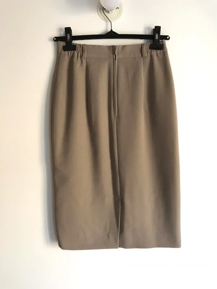 Jupe beige 36 un jour ailleurs, fermeture éclair derrière la jupe. Passant sur le haut de à jupe et doublée. #jupe #jupefemme #jupeunjourailleurs #jupetaille36 #jupedroite36