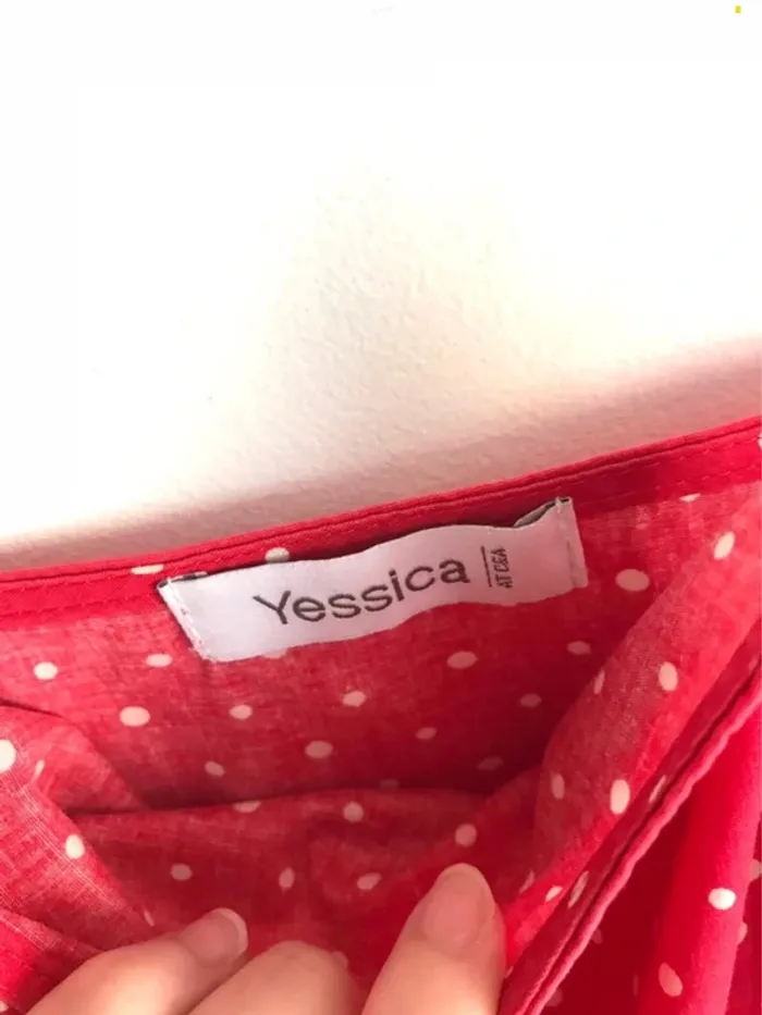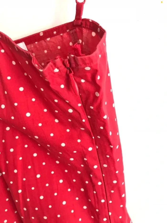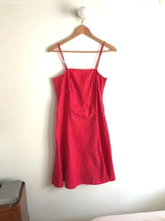 Robe Yessica rouge à pois blancs taille 40. #robe #robefemme #robefemme40 #robefemmeapois #robeàpois #robeapois40 #robeyessica #robeyessica40 #robedete #robedete40 #robedeteapois #robedeteabretelles #robedeteapois40