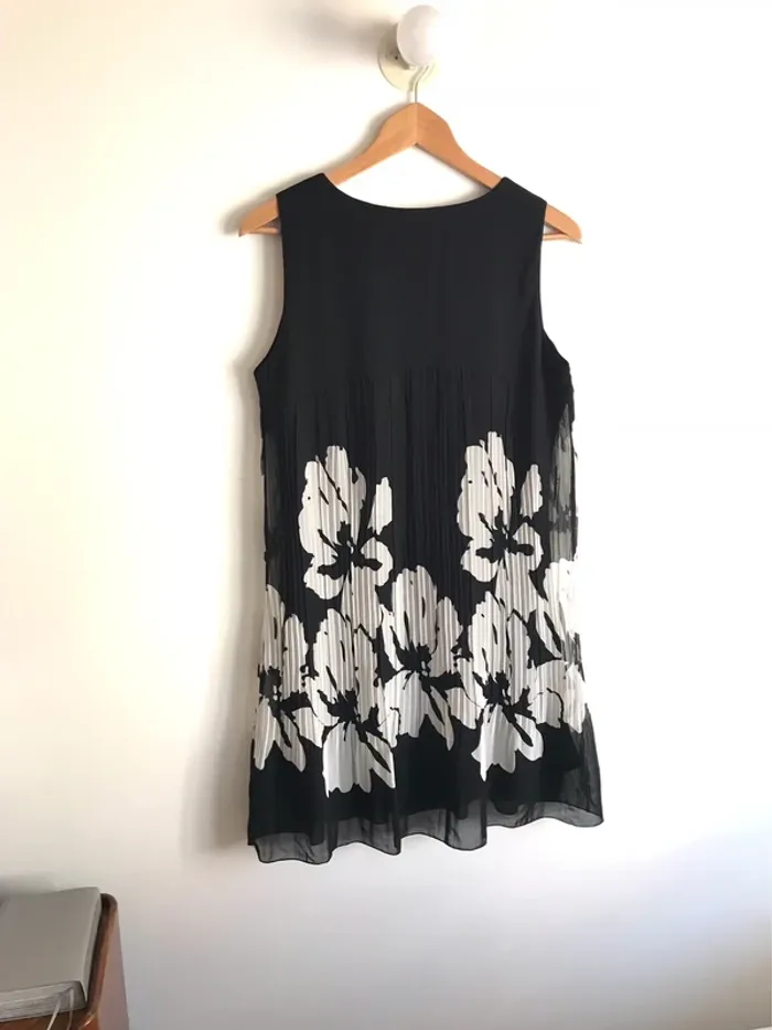 Robe sans manches et plissée noire à imprimés fleuris taille 40. #robe #robefemme #robefemme40 #robefemmeplissee #robeplisséété #robeplissée40 #robeplisseesansmznches #robenoire #robenoire40 #robeimpriméfleuri #robeimpriméfleuri40