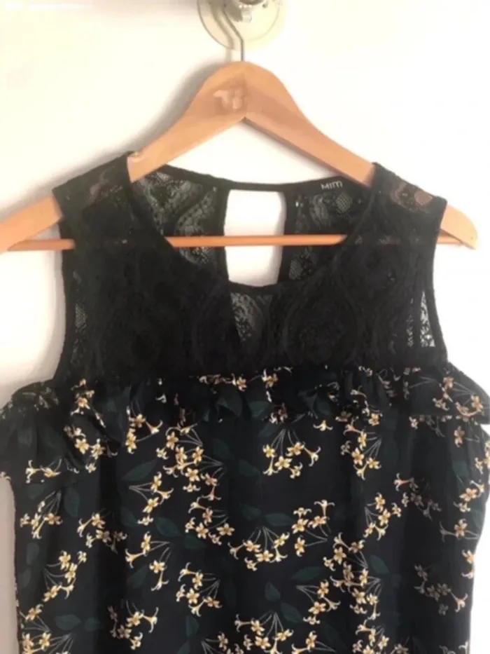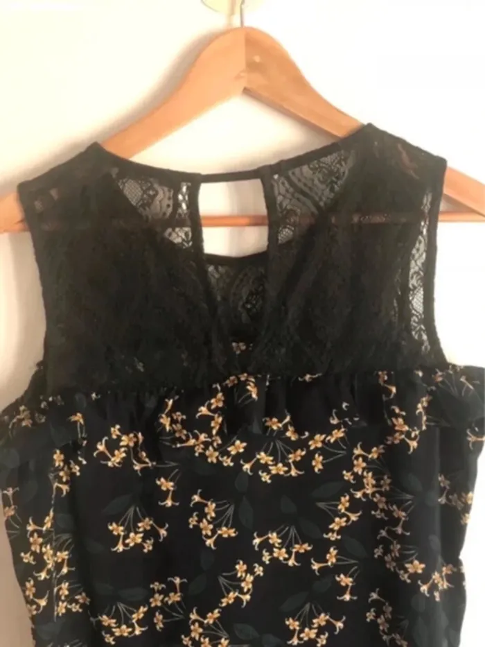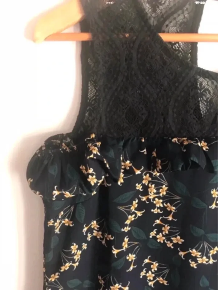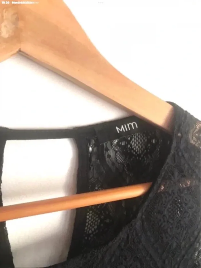 Le haut est aussi en dentelle noire. L’étiquette de composition est manquante.