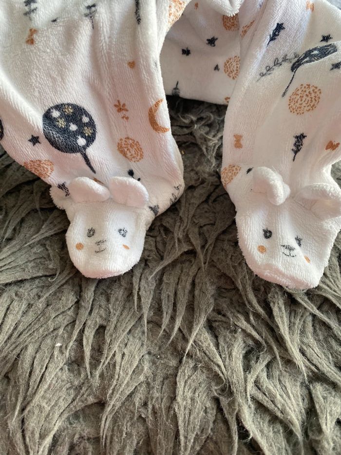 Pyjama en velours S’ouvre entièrement devant par pression Ouverture entrejambe Volant sur les épaules Motif souris sur les pieds Taille 1 mois (54cm) Très bon état #ptite_fan_bebe #ptite_fan_bebe1mois