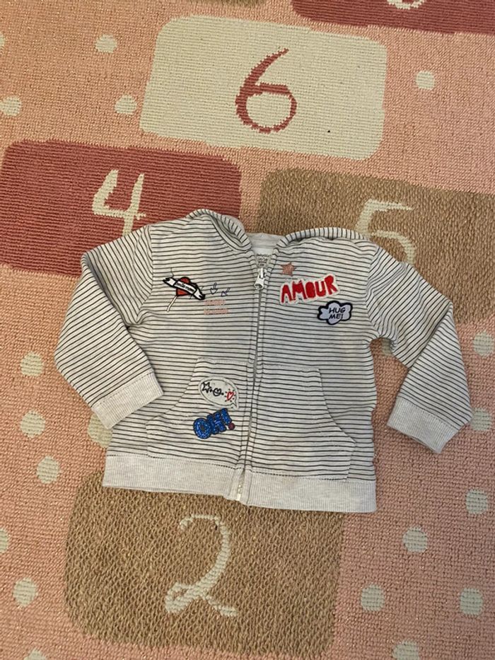 Veste à rayures avec capuche Fermeture zip 2 poches plates devant Écussons en sur-épaisseur Bon état ( écussons avec quelques bouloches) Taille 12/18 mois (86cm) #ptite_fan_bebe #ptite_fan_bebe18mois