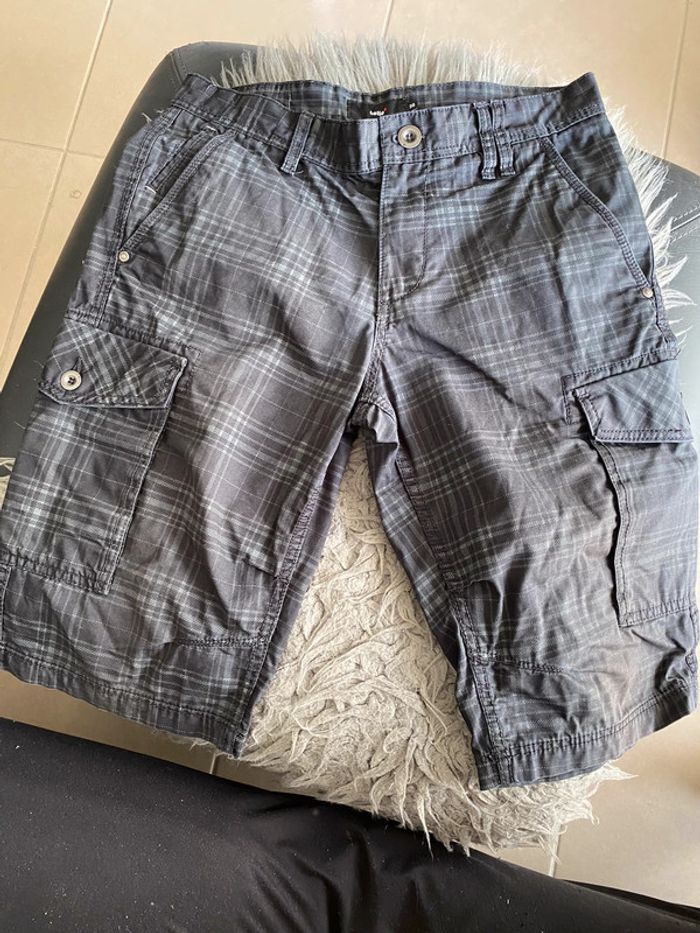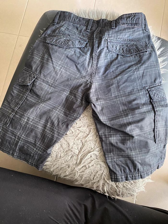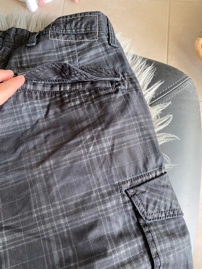Bermuda long à carreaux Nombreuses poches Couleurs :gris-noir Il manque les deux boutons aux poches arrières (cf photo) Taille 38 #ptite_fan_homme