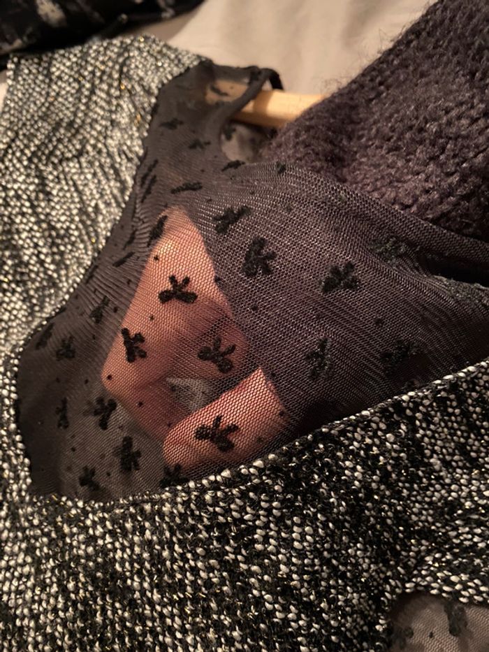 robe chiné noir et blanc avec quelques fibres métalliques pour un effet « paillettes » ceinture élastique à la taille doublure du bas de la robe. encolure avant et haut du dos en mailles transparentes noires avec petits noeuds (cf photo 2) convient à un 34/36 #ptite_fan36 #ptite_fan34