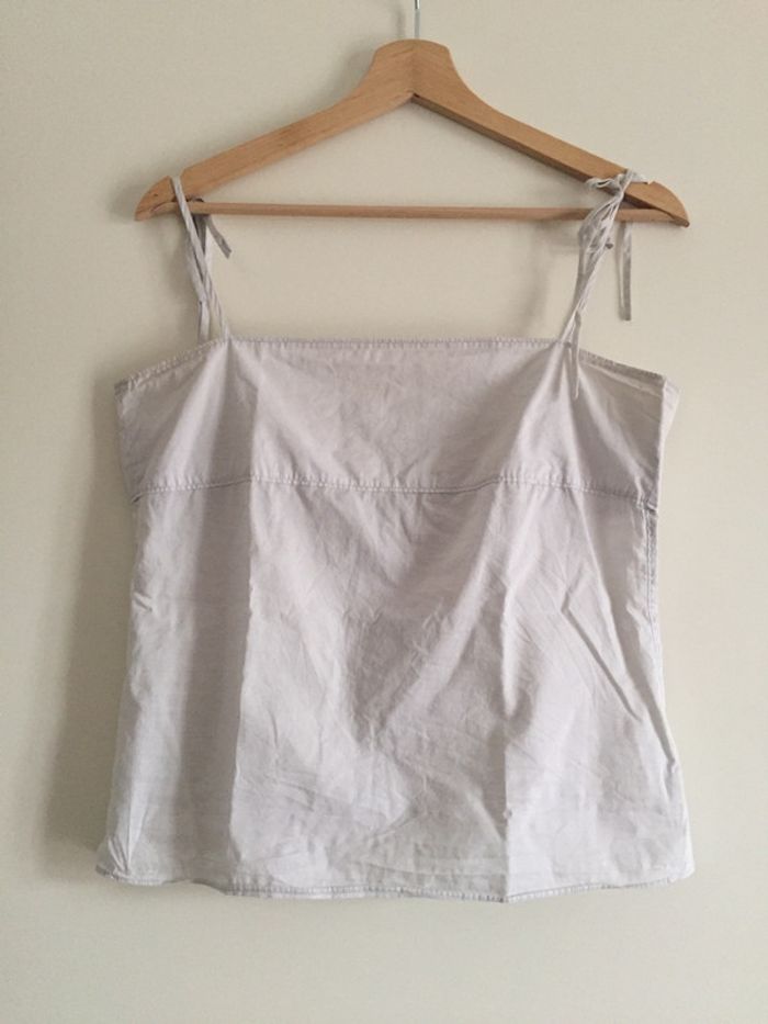 débardeur gris/bleu clair bretelles à nouer sur le dessus de l’épaule entièrement boutonné dans le dos. excellent état taille petit : 36/38 #ptite_fan36