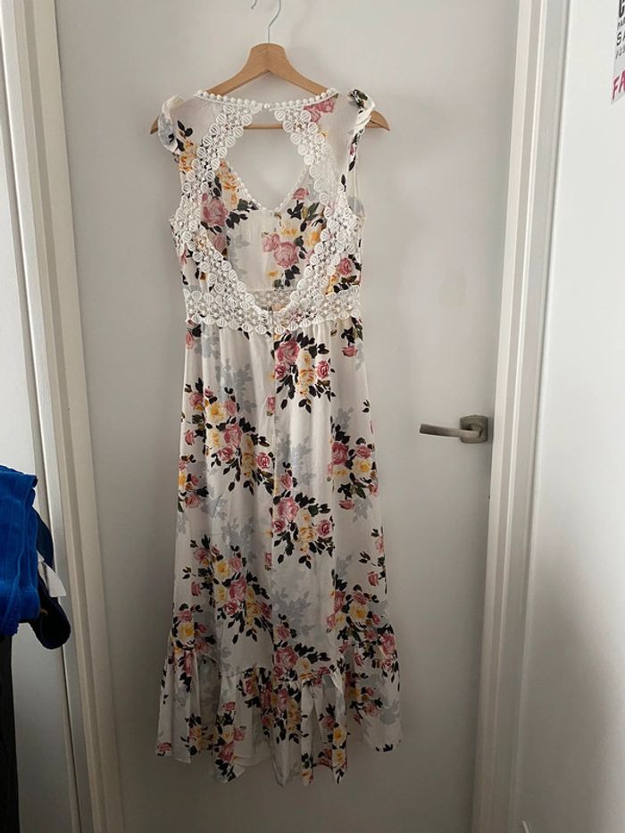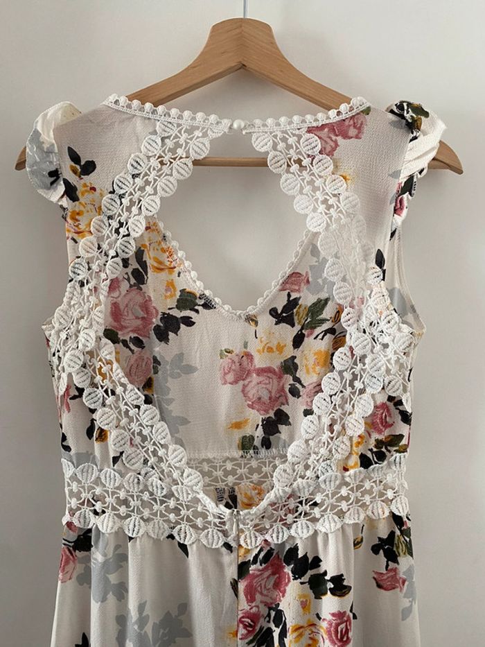 Robe tissu crêpe Très légère Imprimé floral Dentelle sous la poitrine Dos ajouré Fermeture bouton dans le cou et zip dans le dos Asymétrique - plus courte devant que derrière Taille S