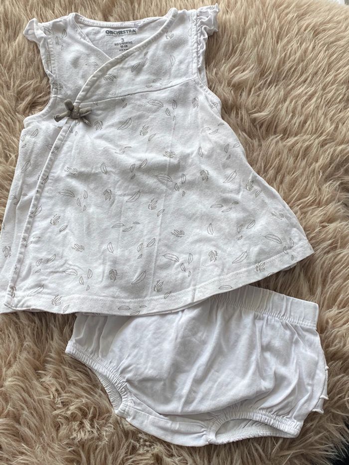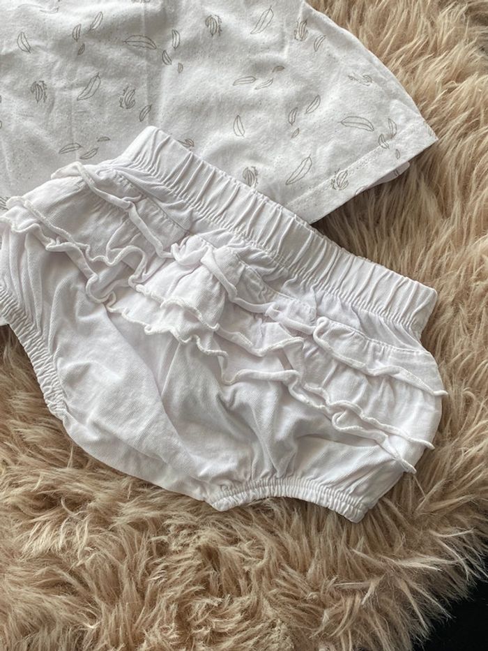 Robe en coton Blanc avec motif plumes S’ouvre entièrement devant par pressions Bloomer assorti (avec volants sur les fesses) Très bon état Taille 3mois (60cm) #ptite_fan_bebe #ptite_fan_bebe3mois