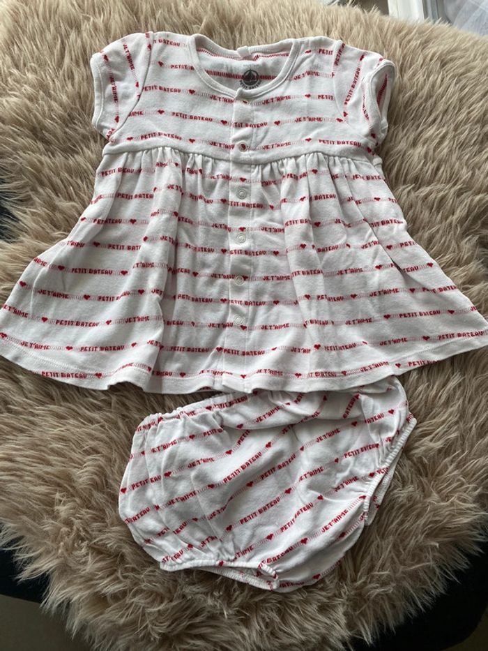 Robe petit bateau en coton Imprimé « petit bateau - je t’aime » Vendue avec le bloomer S’ouvre entièrement par pressions devant Parfait état Taille 6mois (67cm) #ptite_fan_bebe #ptite_fan_bebe6mois