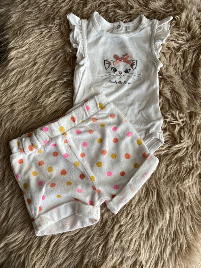 Body Marie (Aristochats) + short en éponge à pois Pressions dans le dos du body, noeud sur la poitrine et volants sur les épaules Faux noeud sur la ceinture du short Parfait état Taille : 3mois (60cm) #ptite_fan_bebe #ptite_fan_bebe3mois