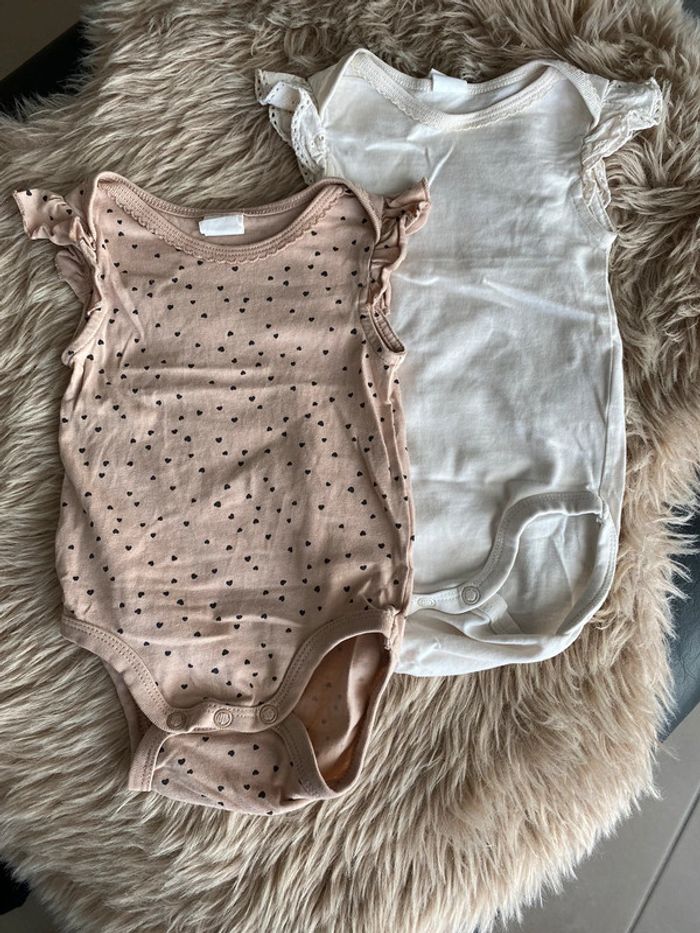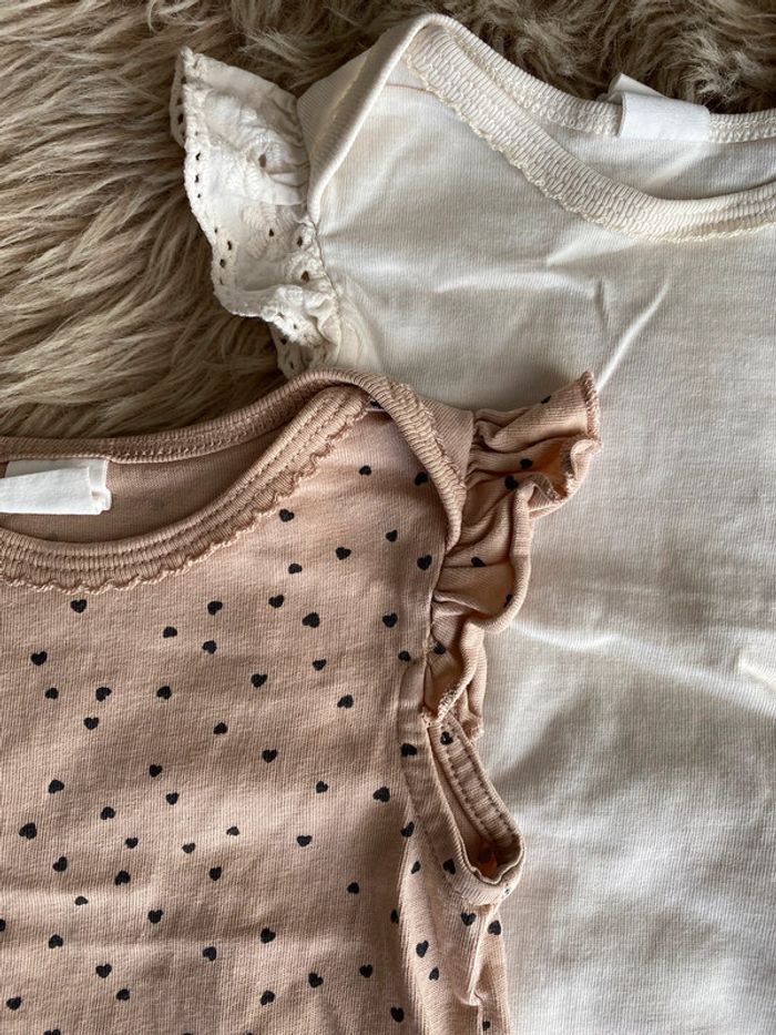 Lot de deux body Volants sur les épaules Crème uni et beige à cœurs Parfait état Taille : 68 cm #ptite_fan_bebe #ptite_fan_bebe6mois