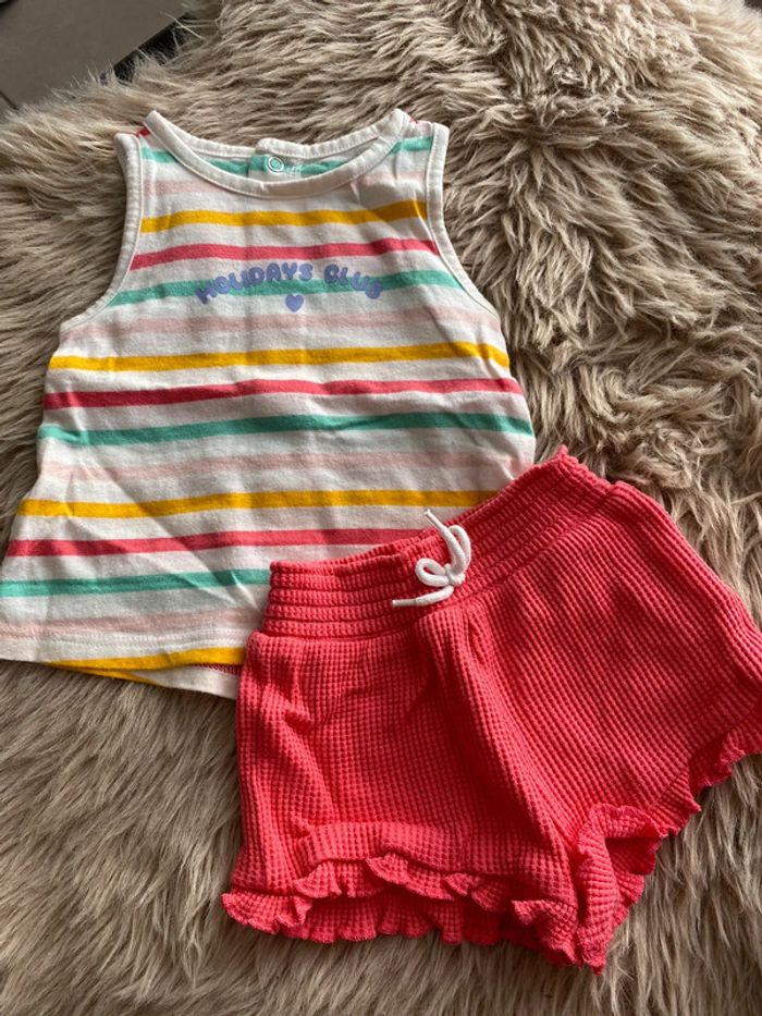 Débardeur à rayures Inscription « holidays club » S’ouvre entièrement par pressions dans le dos Short fushia volants aux cuisses Élastiqué à la taille avec lacet factice Très bon état Taille 3mois (60cm) #ptite_fan_bebe #ptite_fan_bebe3mois