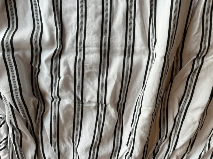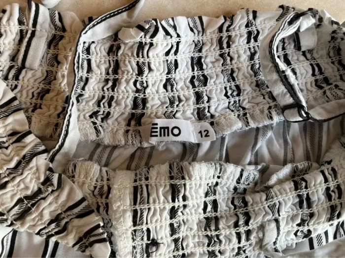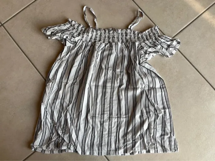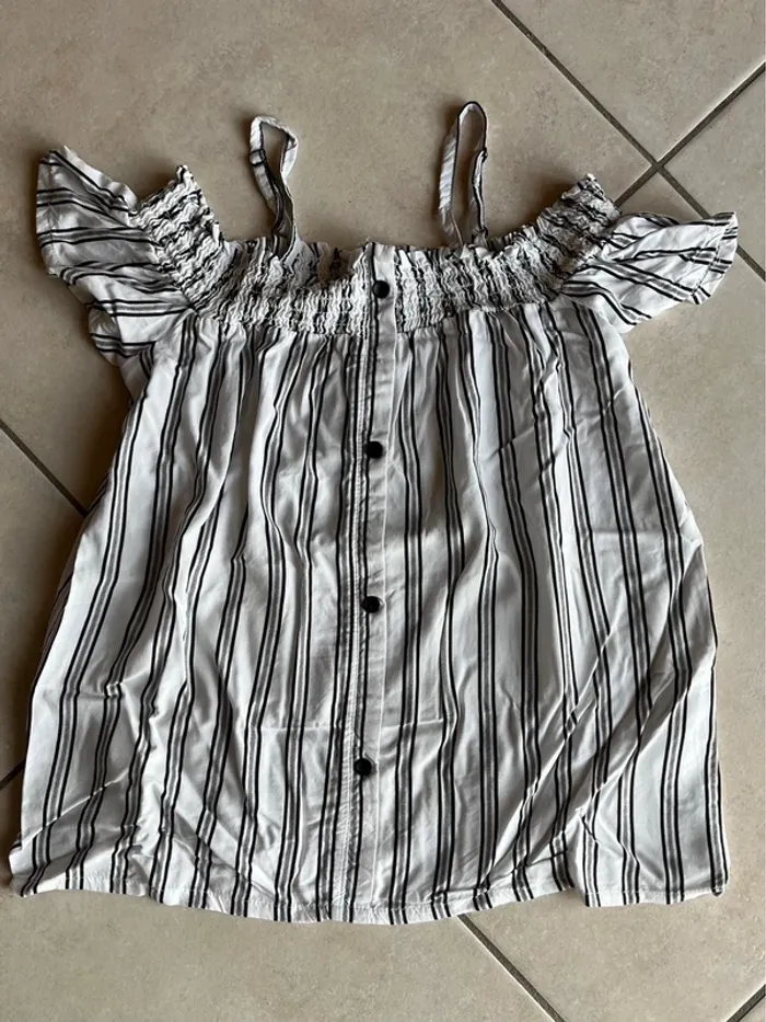 Haut avec manches courtes et fines bretelles, léger, encolure élastiquée, épaules dénudées, boutons décoratifs sur le devant, motif rayures.Très peu porté comme neuf.