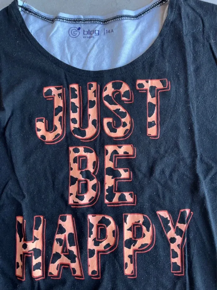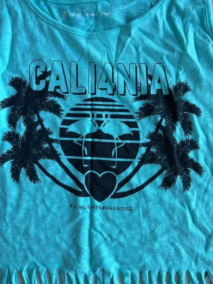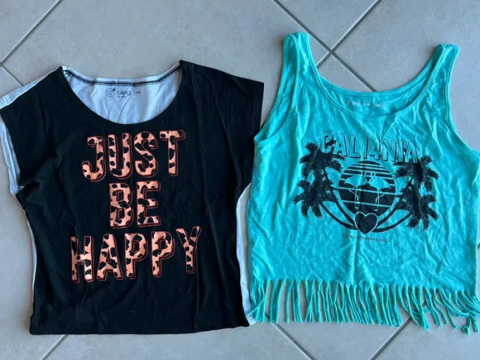 T-shirt avec manches courtes larges et inscription Just be happy+ débardeur léger avec franges et inscription Cali4nia. Excellent état. Prix à l’unité. Tarif réduit pour le lot.