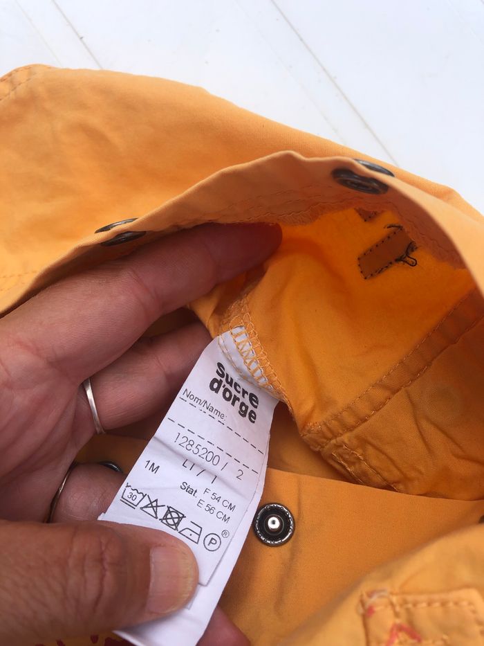 Salopette courte « Sucre d’orge » 1 mois (54cm) Pressions sur le devant et à l’entrejambe 100% coton, tissu léger Ton: jaune-orangé