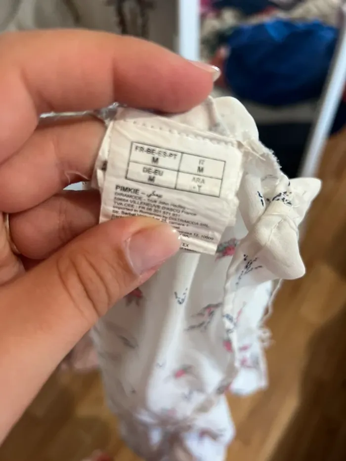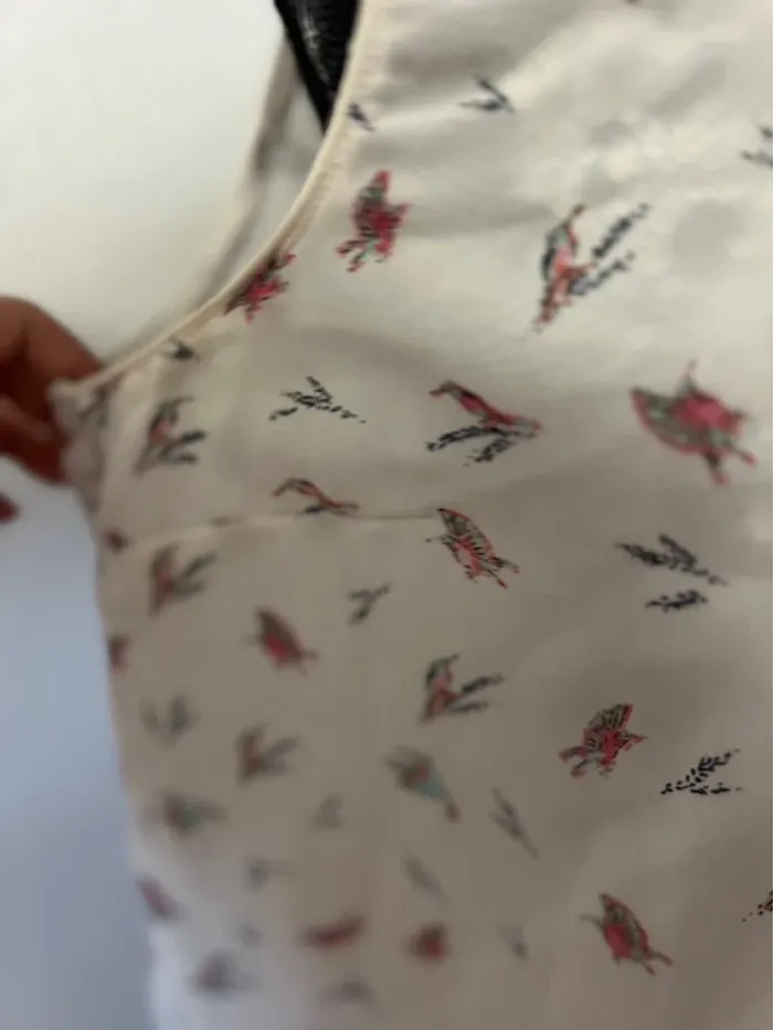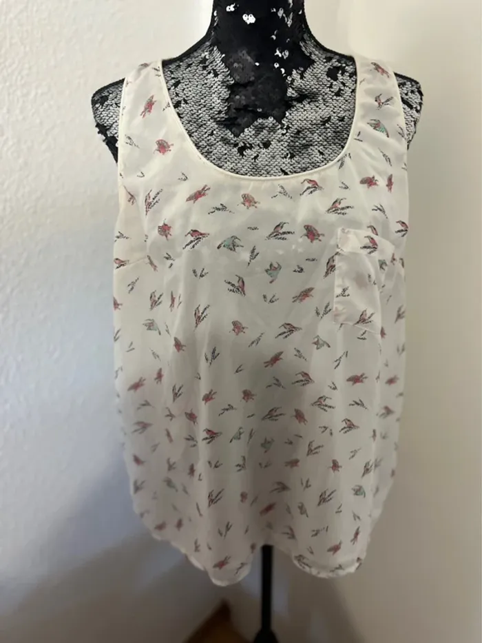 Vend la blouse avec des oiseaux multicolore légèrement transparente. Une poche sur le devant. Une petite doublure sur le devant. Taille M mais peut aller jusqu’à XL Porte une ou deux fois