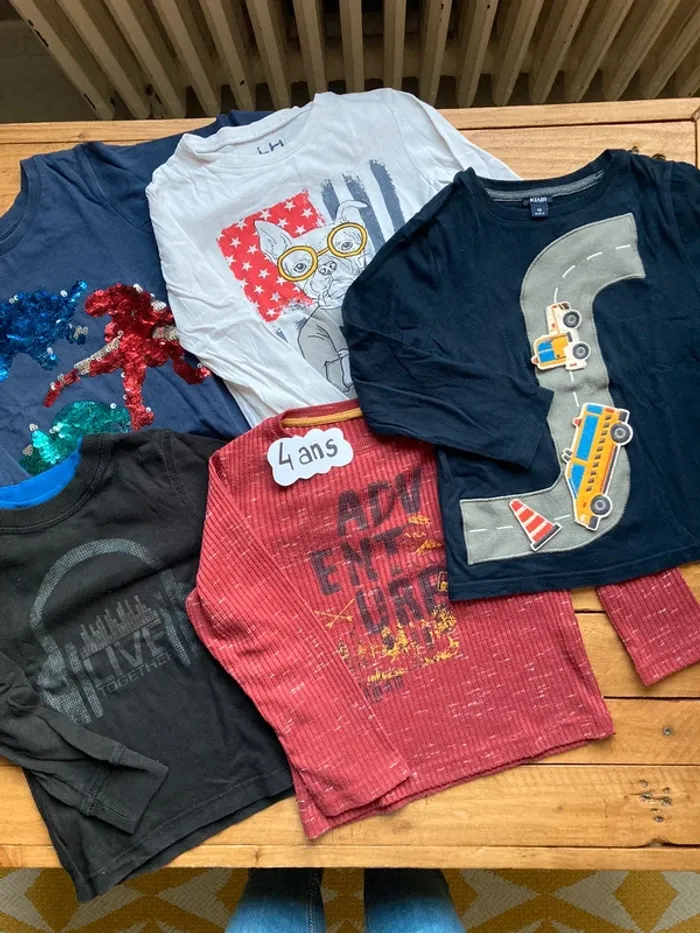 5 tee shirts manches longues Kiabi La halle okaidi… 4 ans Véhicules route avec pièces à repositionner, montagne, chien… Très bon état à bon état #kryptana_quatreans