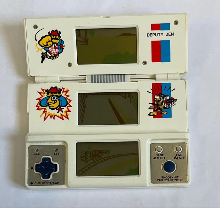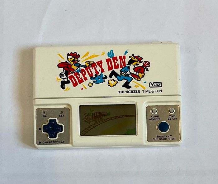 Vend console de jeux portable style Game & Watch Adjoint Den V-Tech Tri Screen Time & Fun ancienne de 1982. Entièrement fonctionnel (testée avant mise en vente) Écran LCD 4 jeux possible Fabriqué à Hong Kong Tout mes autres jeux et consoles : #theor58jeuxetconsoles