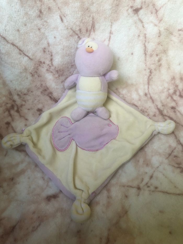 Doudou plat pingouin manchot Jaune mauve violet En broderie un poisson +/- 24 cm Jemini Occasion en bon état Vous achetez le doudou que vous voyez sur la photo