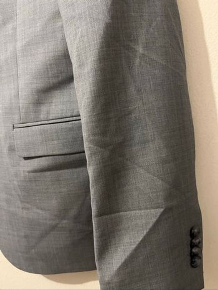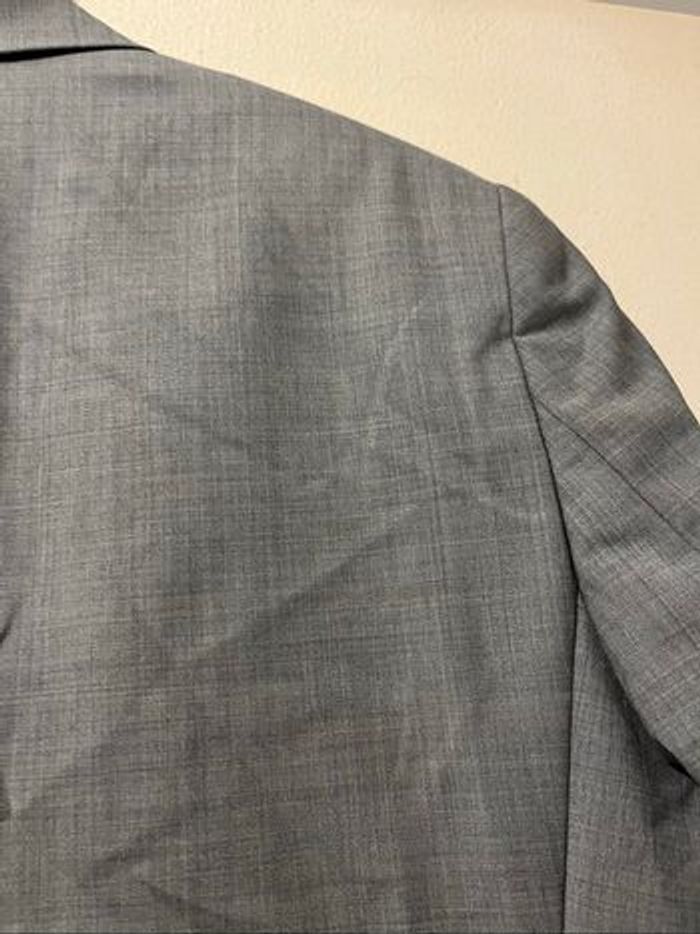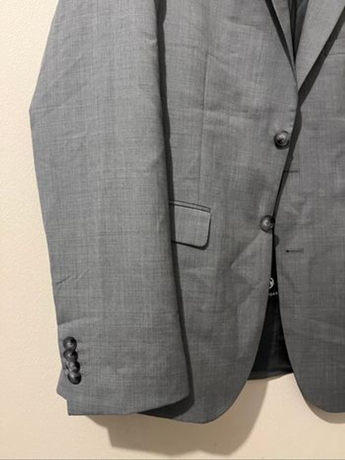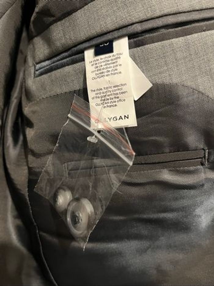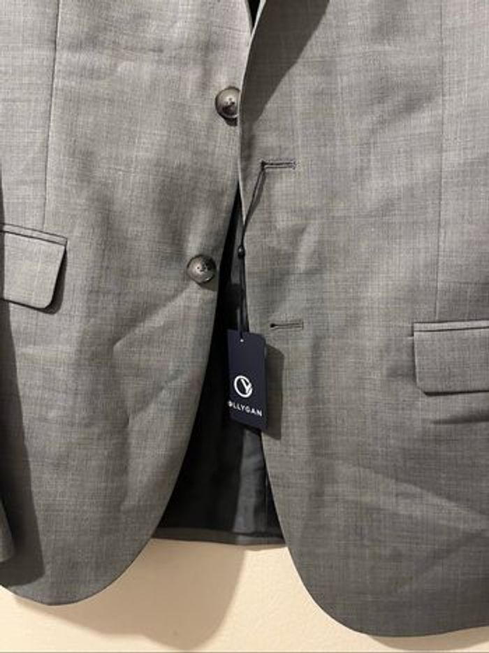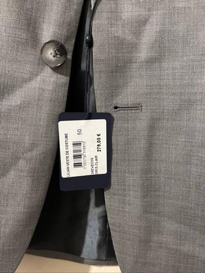 Veste de costume homme de la marque Ollygan, couleur gris clair. Coupe classique et élégante, idéale pour le bureau, un mariage ou une occasion habillée. Fermeture 2 boutons, poches à rabats, poche poitrine. Intérieur doublé. Voir photo 4 légère trace Neuf avec étiquette Prix étiquette 279€