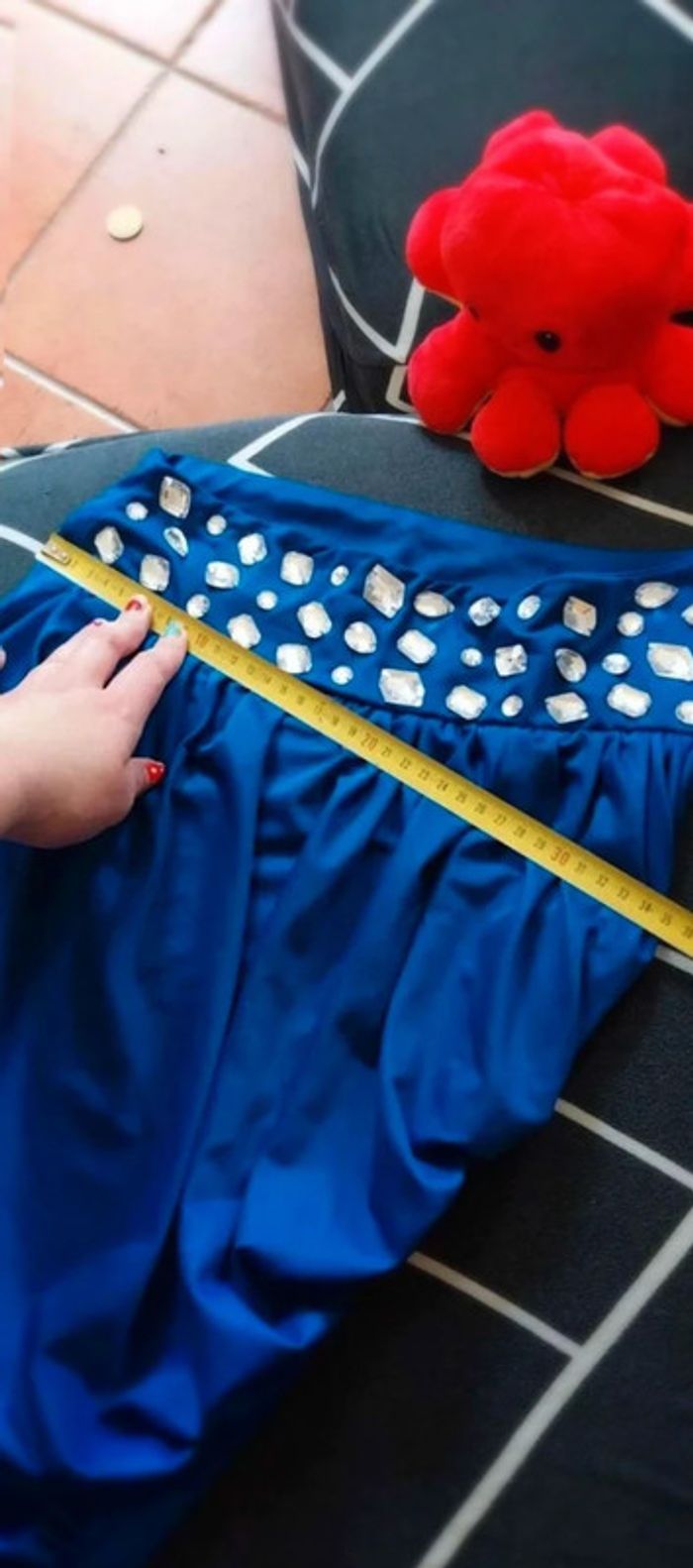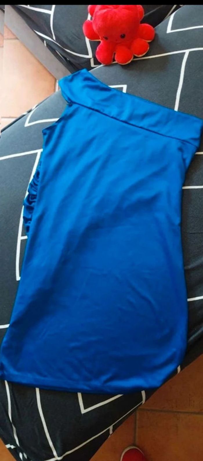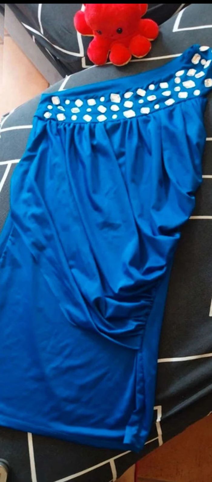 Jolie haut bleu avec strass diamants.1 bretelle de manche et 1 épaule denuder Haut long. TU. Aisselle 34cm. Longueur 80cm. Tissu elastique donc extensible. Legerement doucousu sous bras voir photo. Ne ce vois pas porter. #femmeadelicia44