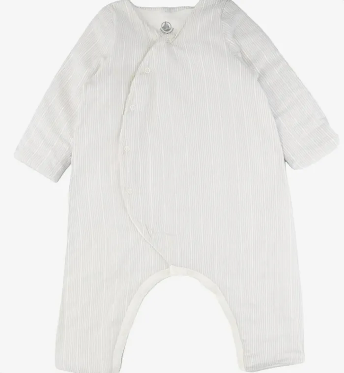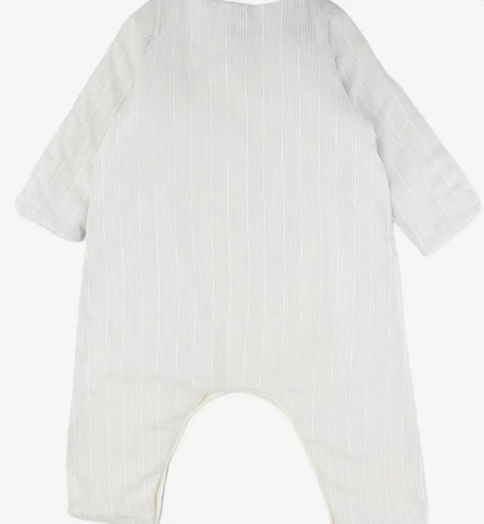 Neuf sans étiquette, jamais utilisé. Coloris : Gris, Blanc Taille : 6 mois Saison : Automne / Hiver Genre : Mixte DÉTAILS Manches longues, Ouverture pressionnée sur le devant et à l'entrejambe pour faciliter l'enfilage, À rayures verticales Confortable COMPOSITION 98% Coton, 2% Fibre métallisée ; Doublure : 100% Coton