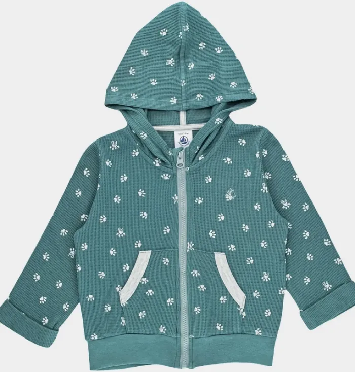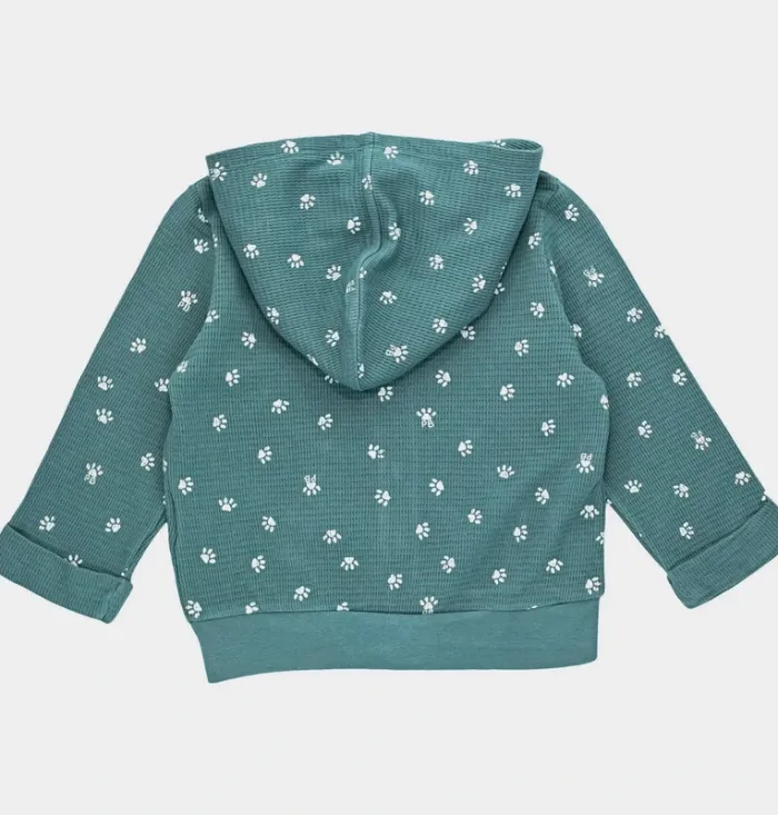 Neuf, jamais porté ! Coloris : Vert, Gris Taille : 12 mois Saison : Toutes saisons Genre : Mixte DÉTAILS Motif, Manches longues, Capuche insérée dans le col, Poches sur le devant, Ouverture par zip sur le devant Matière légère COMPOSITION 100% Coton PAYS DE FABRICATION Maroc