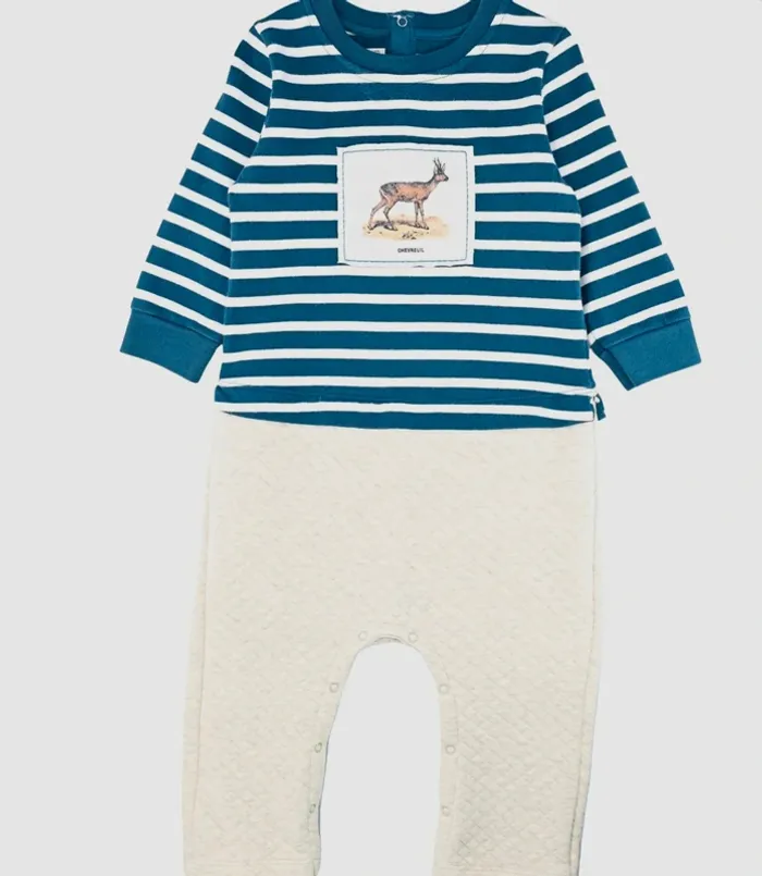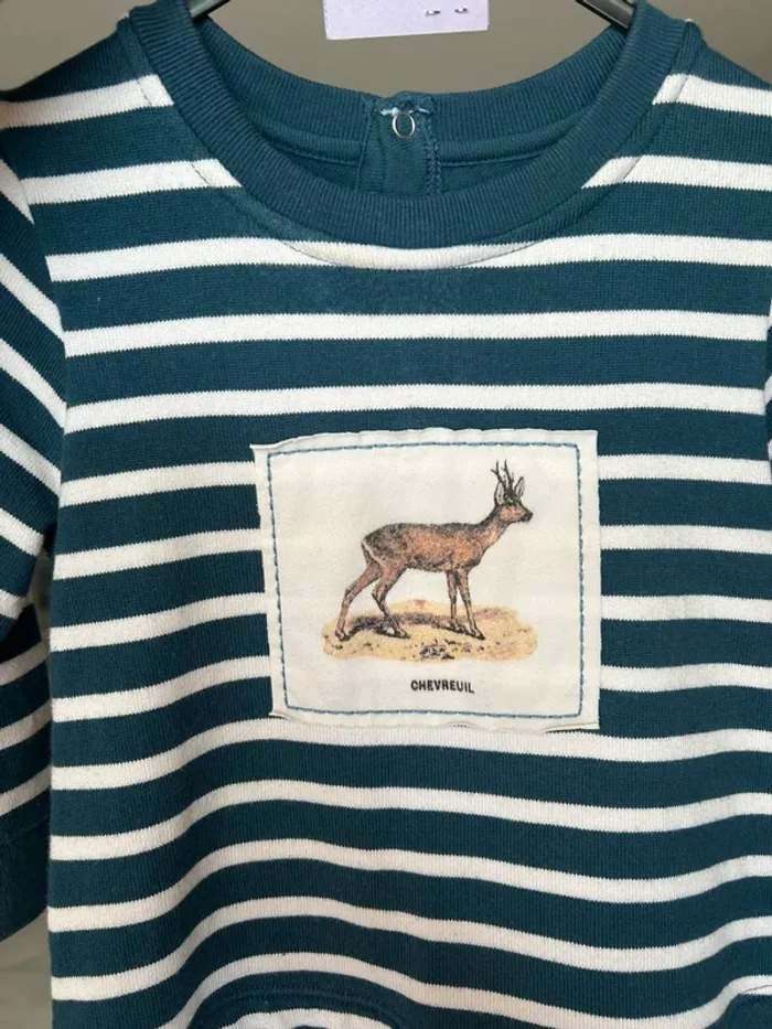 Très bon état, mais légère usure niveau col Coloris : Gris, Vert, Blanc Taille : 24 mois Saison : Toutes saisons Genre : Garçon DÉTAILS Col rond, Manches longues, À enfiler, Bouton-pression au dos, Imprimé chevreuil Combinaison longue bi-matière, Pressions à l'entrejambe pour faciliter le change COMPOSITION Haut : 100% Coton, Bas : 75% Coton, 25% Polyester PAYS DE FABRICATION Maroc