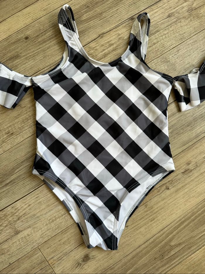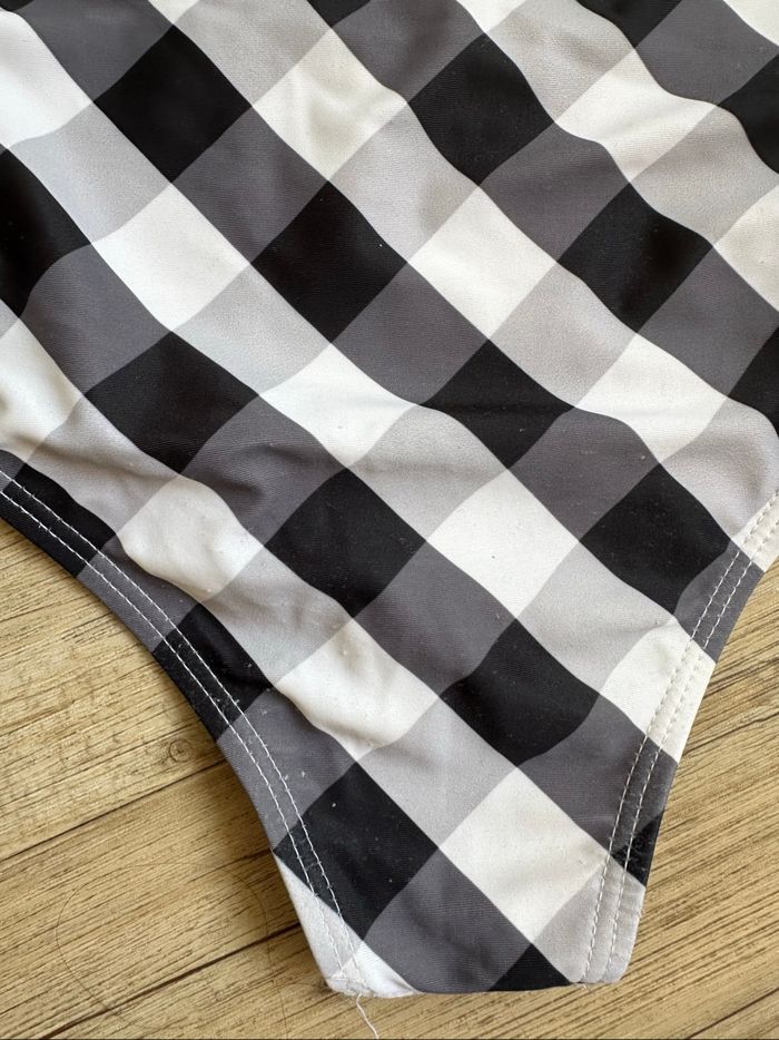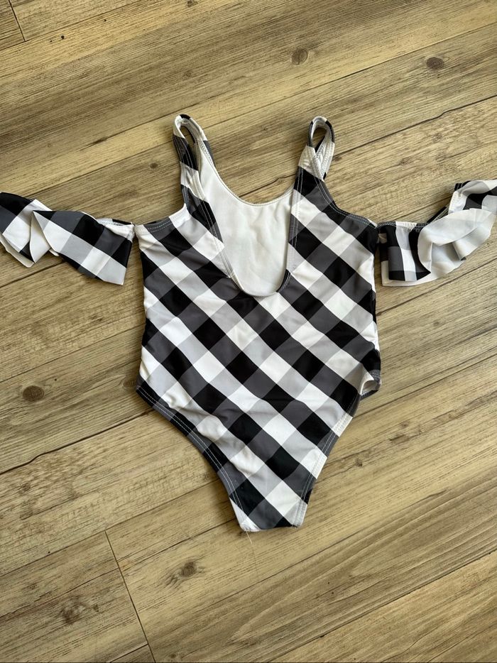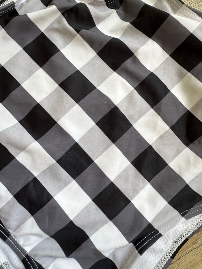 Magnifique Maillot de bain une pièce à carreaux Vichy noir et blanc Manche à volant qui retombe sur les bras et dos plongeant Porté mais excellent état général