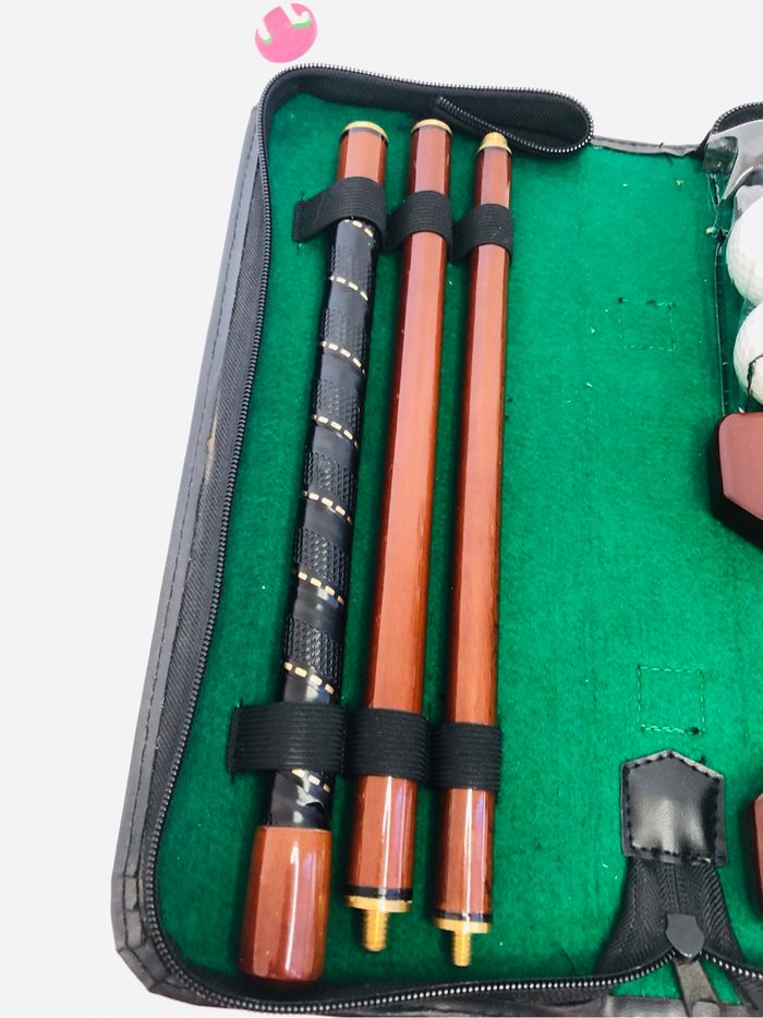 Kit de voyage pour club de golf en bois. - Type de produit : Kit de golf - Utilisation : Voyage - Matière : Bois Avec étui de voyage et balles En très bon état