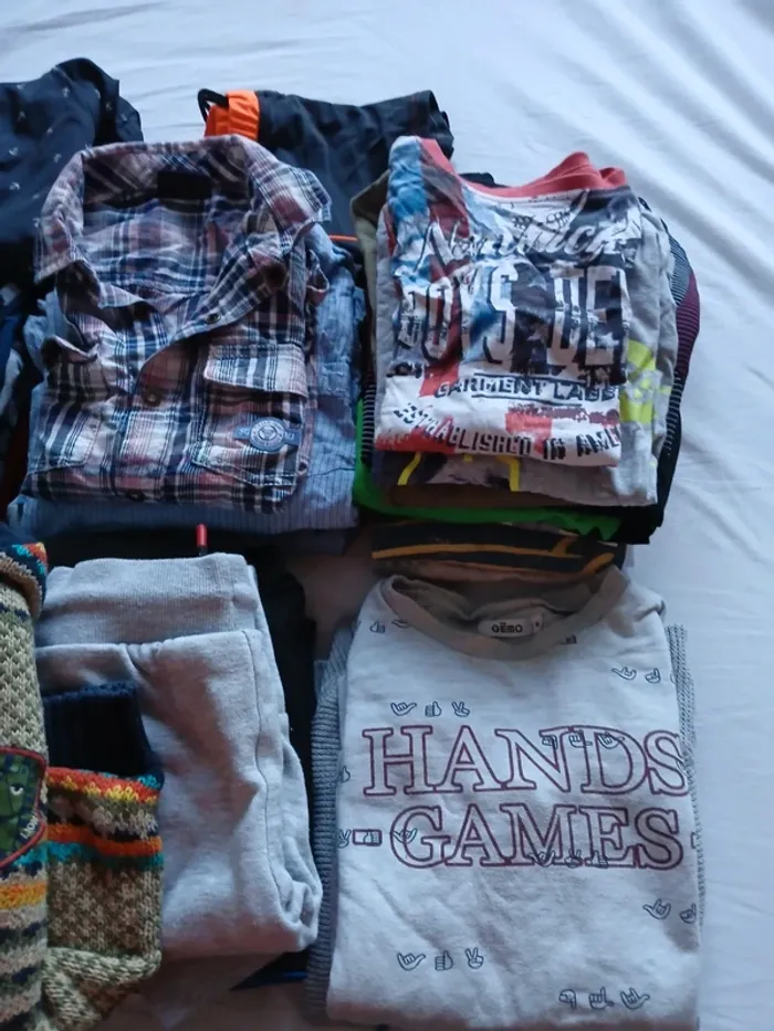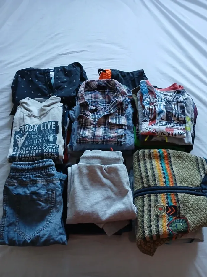 4 shorts 6 Tee-shirt manches longues 1 coupe vent 2 jogging 1 jeans 4 chemises 2 maillots de bain 1 gilet 2 pulls 10 Tee-shirts manches courtes