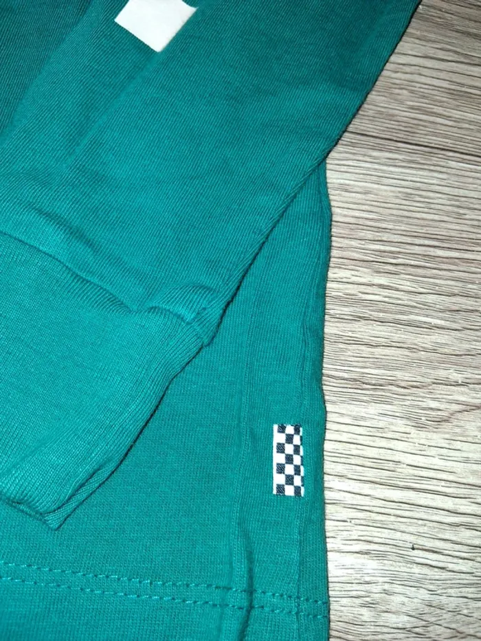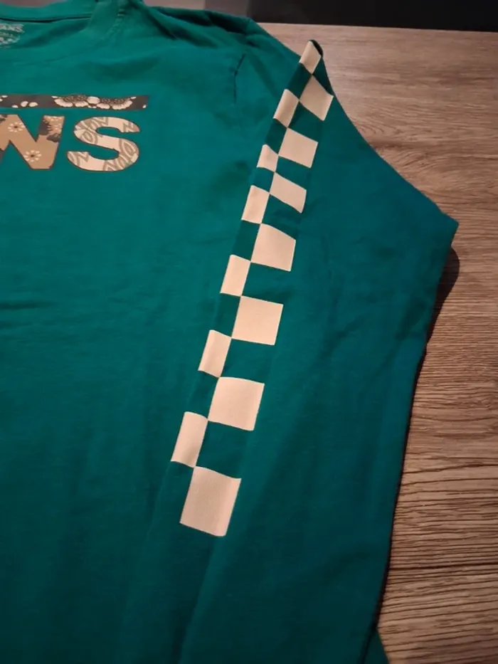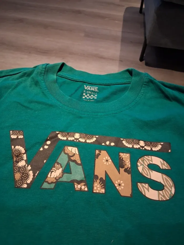 Bonjour, je vends ce tee shirt vert avec motifs de la marque Vans taille XS en très bon état.